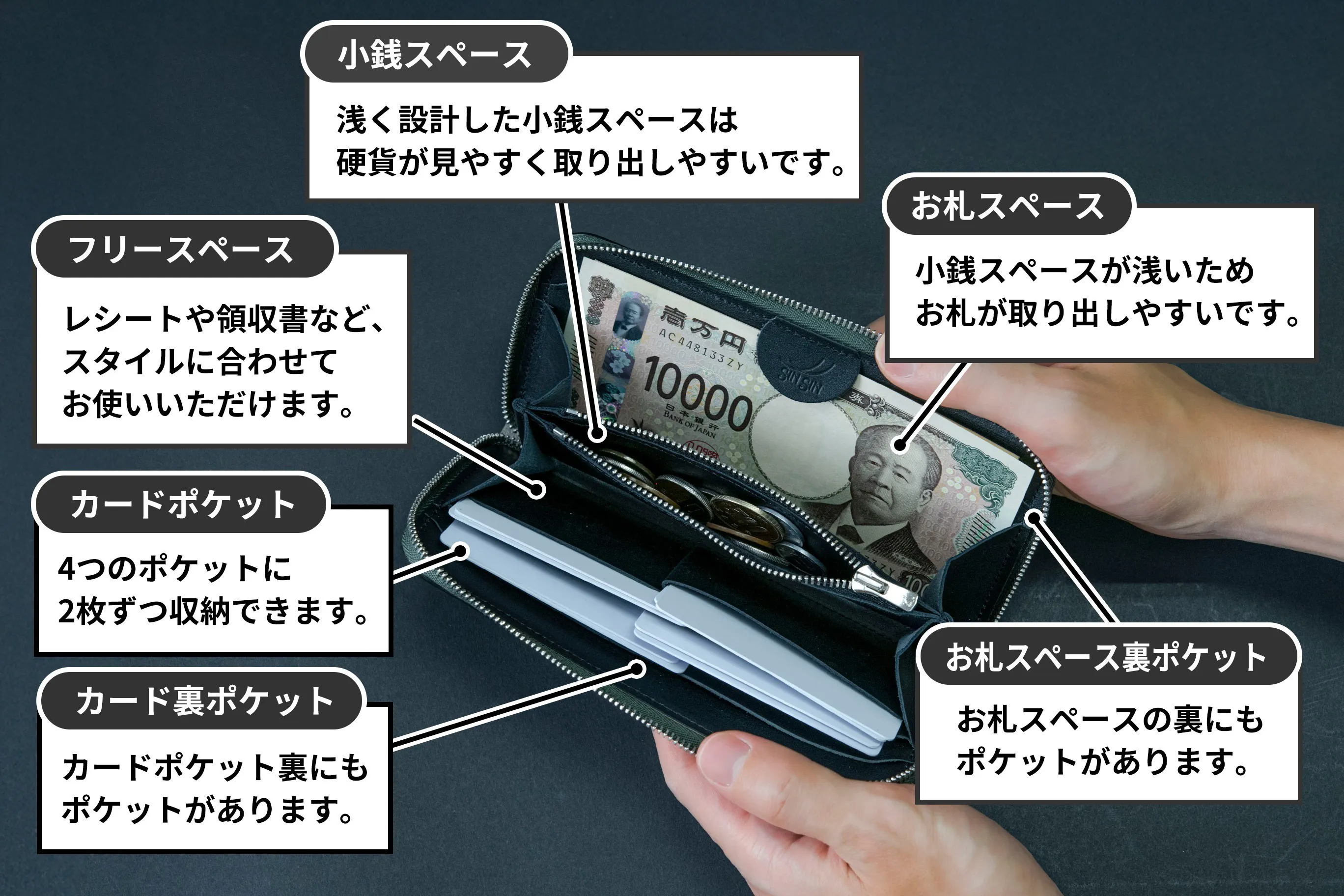 従来までのラウンドジップ長財布は小銭入れが深くて全体が見えづらく、取り出しにくいものが多かったため、改良を重ねました!