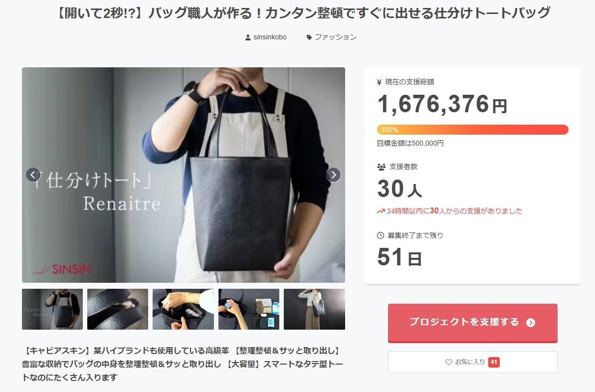 本日より、『【開いて2秒!?】バッグ職人が作る!カンタン整頓ですぐに出せる仕分けトートバッグ』のプロジェクトがスタート致しました!