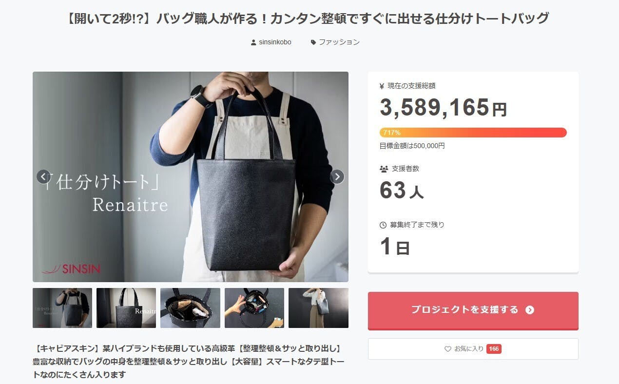 そんな方にぴったりの仕分けトートバッグ『ルネートル』。プロジェクト終了間際は駆け込み支援が増える傾向がありますので、気になっている方はぜひお早めにご検討ください!
