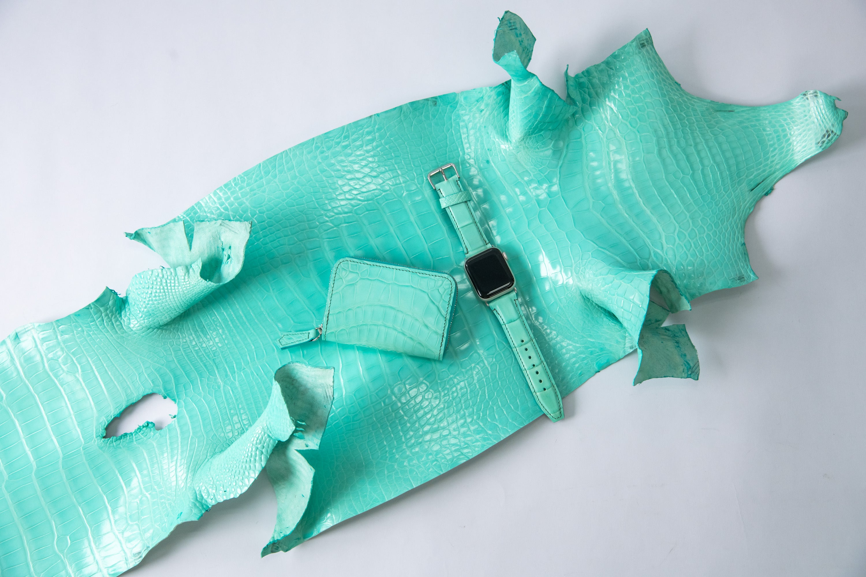クロコダイルはひとつひとつ個体によって、模様が違います。なので完成したアップルウォッチバンドの模様は同じものが存在しません。職人がひとつひとつ丁寧に裁断箇所を選んで裁断しています。