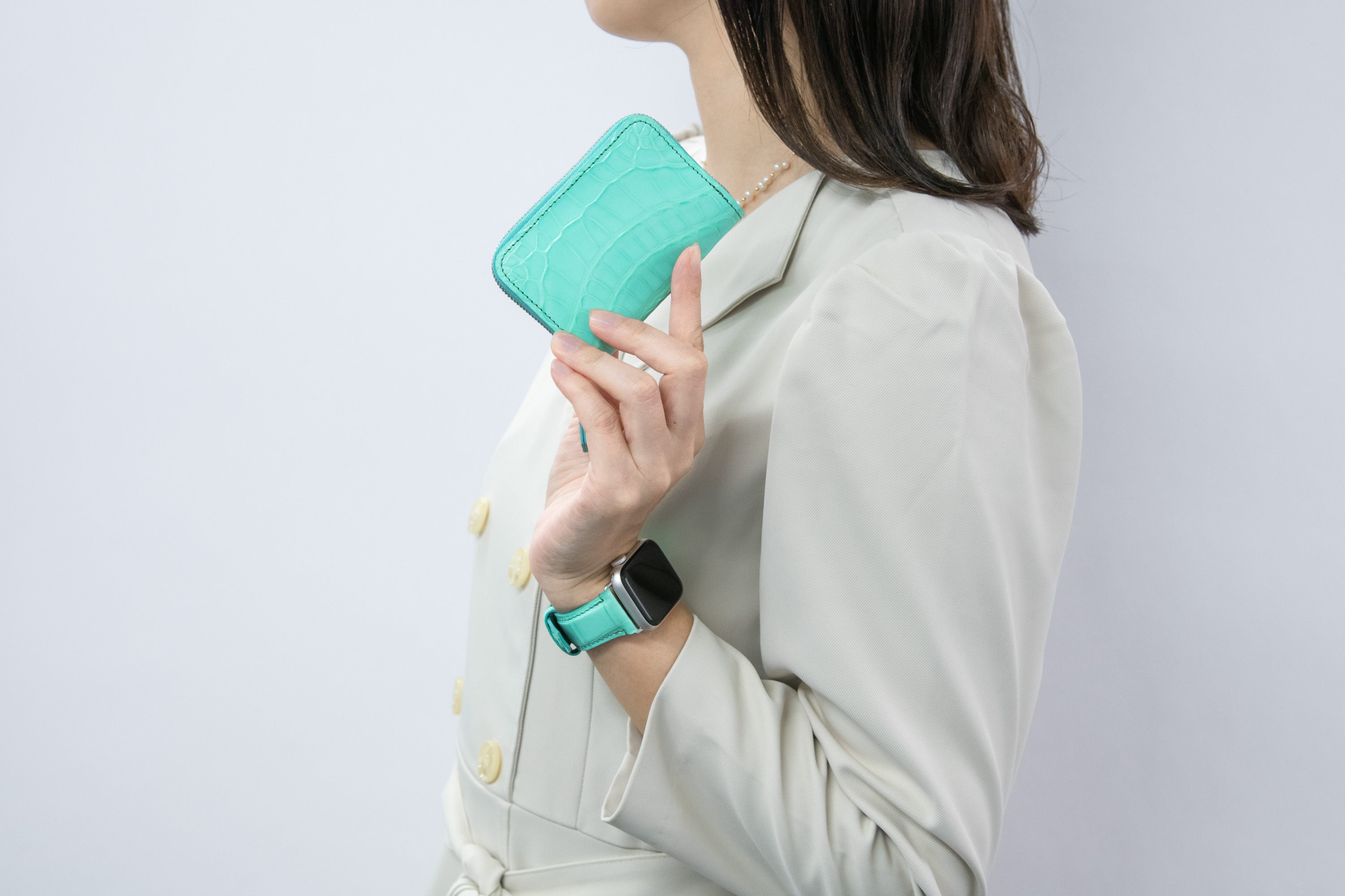 ※裏面のレザーは水に強いですが、金具、表面のシャイニークロコダイルレザーに関しては洗うことはできません。万が一洗ってバンドが痛んでも、返品の対応はできかねますのでご了承ください。
