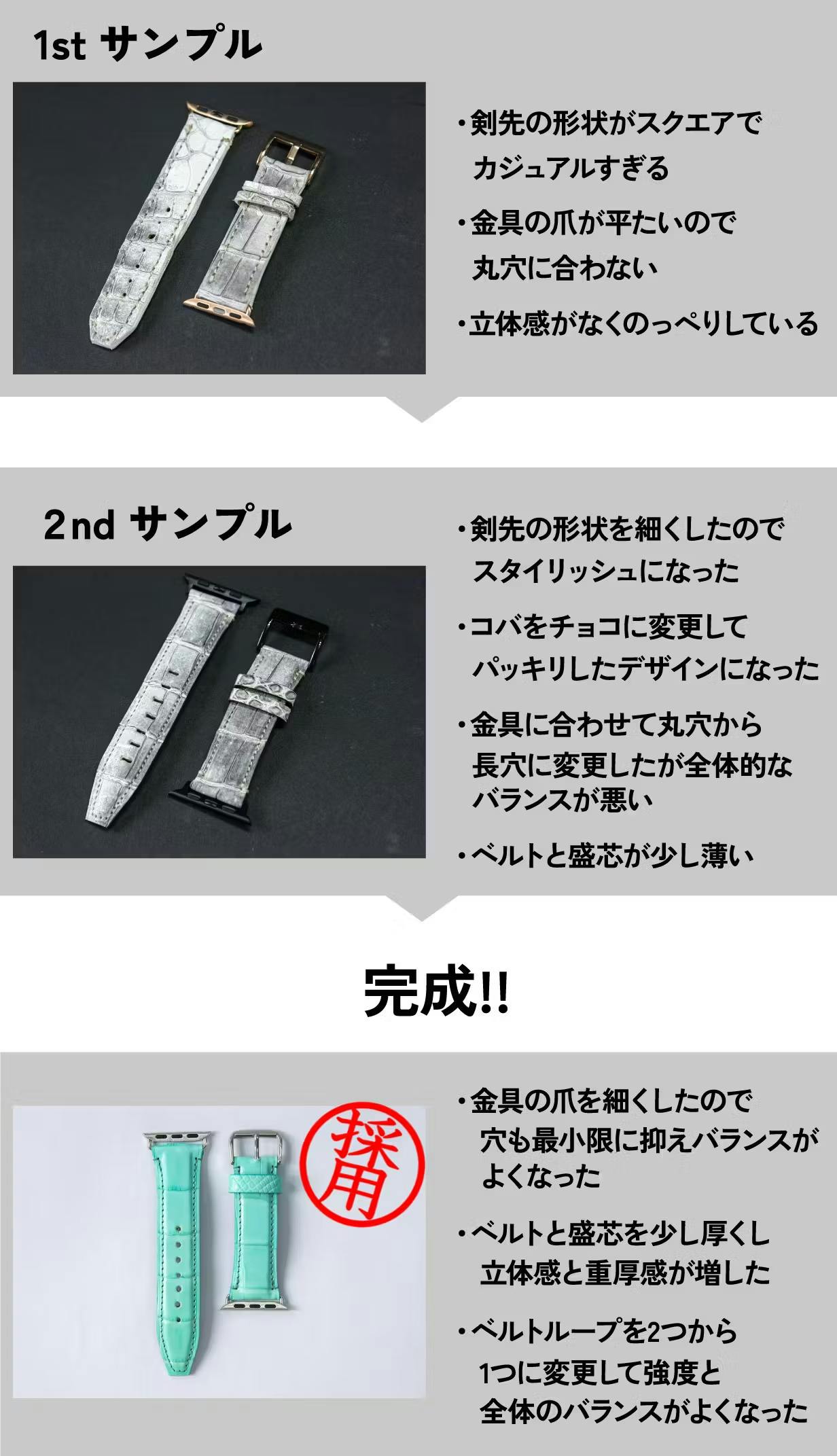 初めまして、新進工房の革職人の仙入雅之と申します。今回も新進工房のスタッフみんなの知恵を寄せ集めて、ようやく完成することができアップルウォッチバンドです。