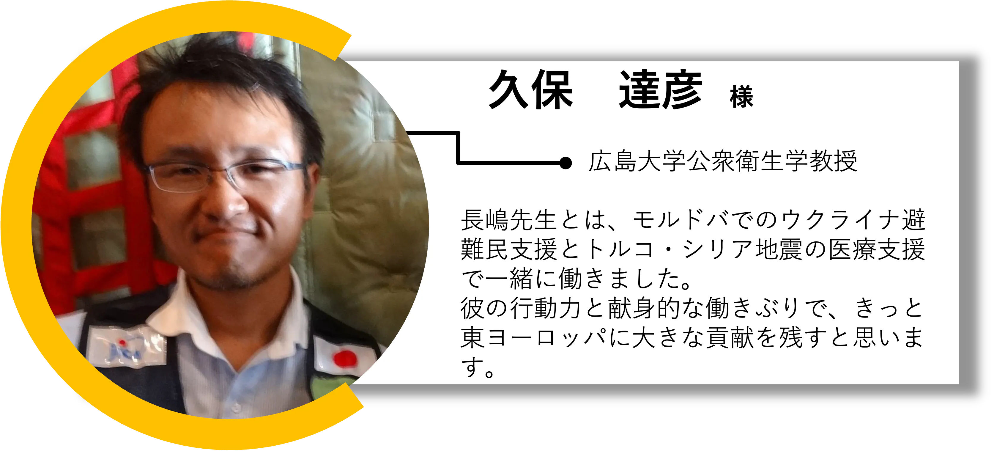 災害医療体制の標準化をされている教授です。被災地支援のたびにWHOからNGOの橋渡しをして下さり、医療活動に多大なるサポートをいただきました。広島大学公衆衛生学のウェブページはこちら。