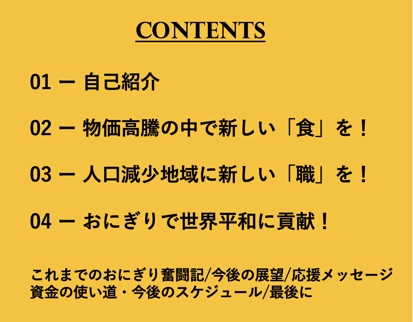 その負のサイクルの中に突破口を開けたいというのが私の思いです。もちろんおにぎり屋だけで平和になるなどとは思ってません。ただ私の挑戦が色々な人を焚き付けて、この土地に新しい流れが生まれることを望んでいます。そのために是非みなさんのお力をお貸しいただきたいと思ってます。