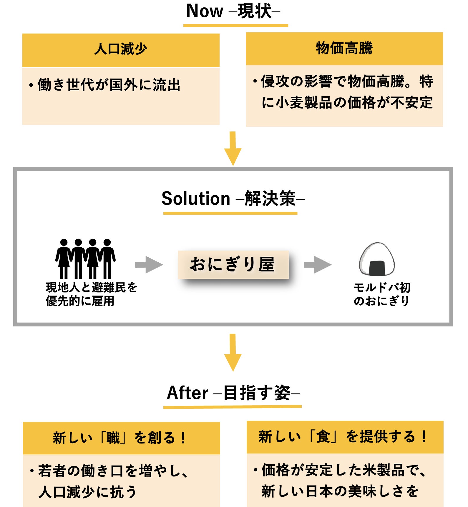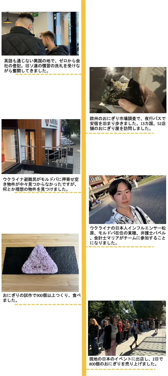 侵攻が始まりもうすぐ3年が経とうとする中で、人道支援だけでなく別の方法でも人々に貢献する必要性があると感じています。色々な選択肢を考えた結果、おにぎり屋を始めることにしました。侵攻中のウクライナ国内で飲食店を創業することは現時点では難しいと判断し、まずはウクライナ避難民を受け入れ続けている隣の国のモルドバでおにぎり事業を始めます。