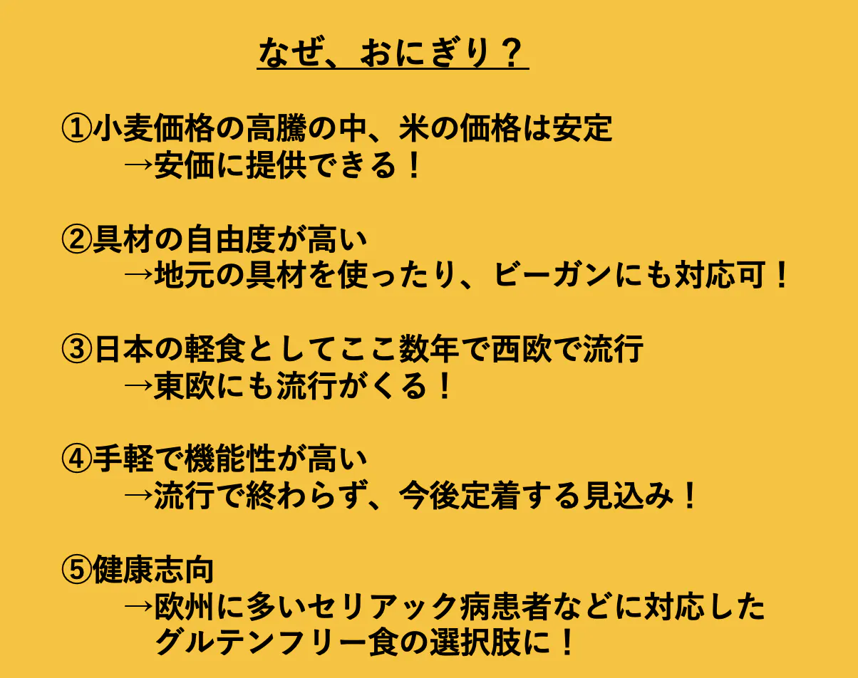 このような状況の中でおにぎりを通してこの地域に貢献したいと考えました。そこでなぜ、おにぎりなのか?それについては、次の通りです。