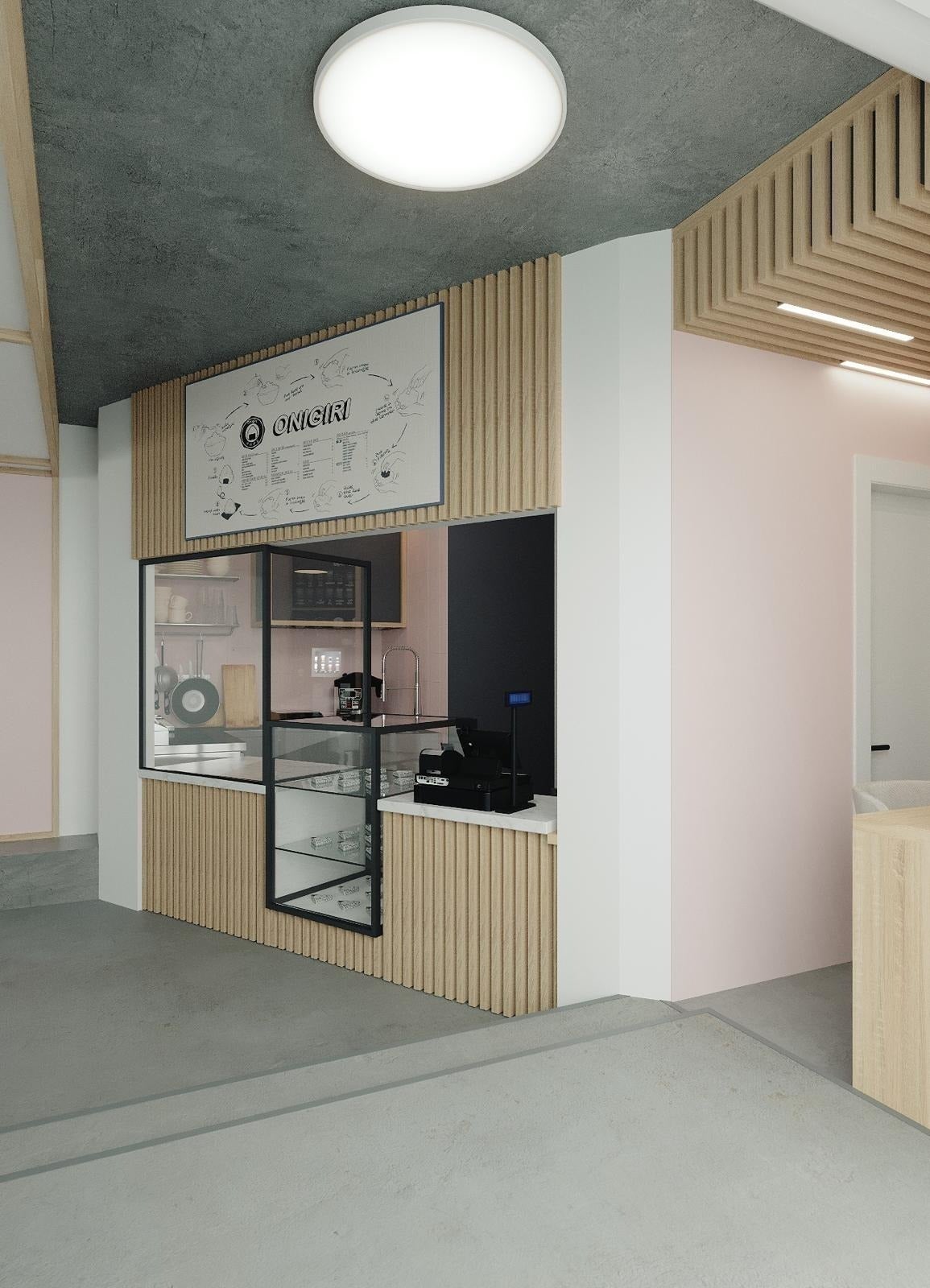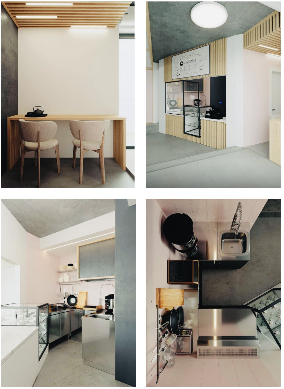 上の画像は、現地のデザイン業者による店舗イメージ図です。桜の色合いを基調とし、木材を取り入れることで、日本の伝統的な和の雰囲気を演出しています。店舗面積は約30平米で、テイクアウトとデリバリーを主軸としつつ、店内およびテラス席でのイートインにも対応可能な設計となっています。