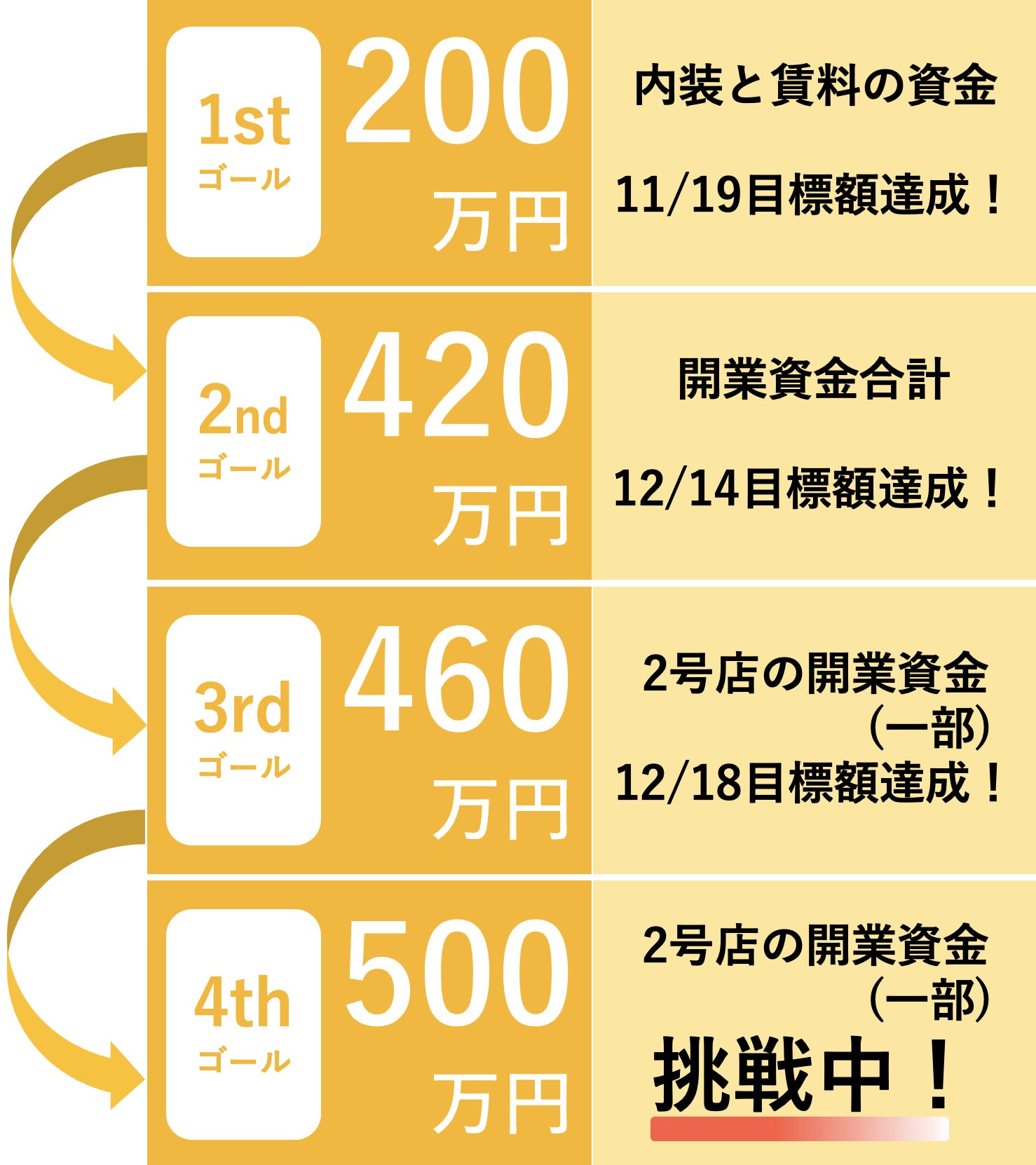最後の一踏ん張りとして、ファイナルゴールを500万円(「資金の使い道」参照)に設定しました。