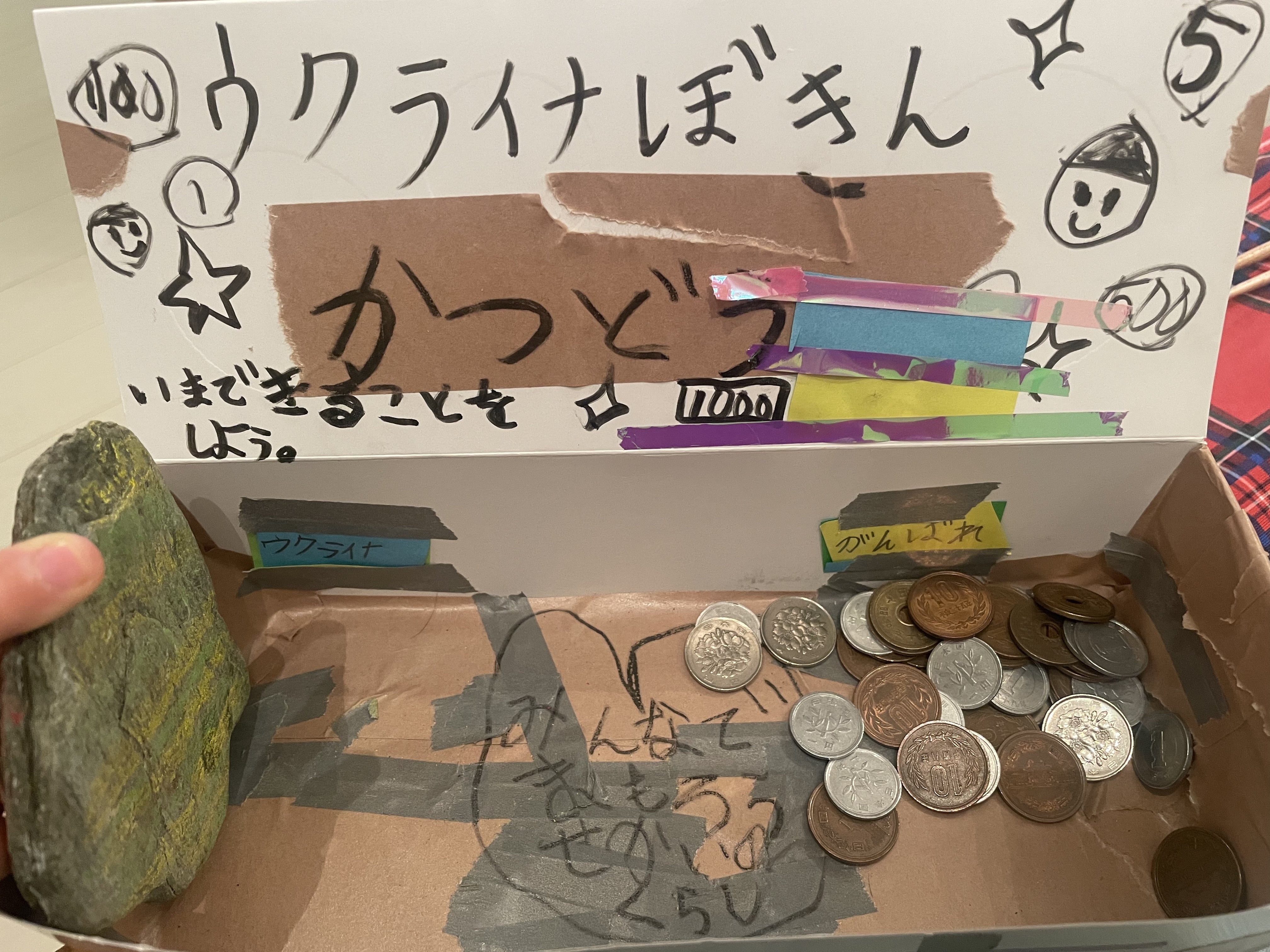 子ども達が自分たちで作ったウクライナ支援募金の箱。一言も文言の指定はしてませんでしたが、「いまできることをしよう」「みんなでまもろせかいのくらし」「ウクライナ」「がんばれ」と書かれていました。大人が歩く背中を子ども達は見ていると思います。