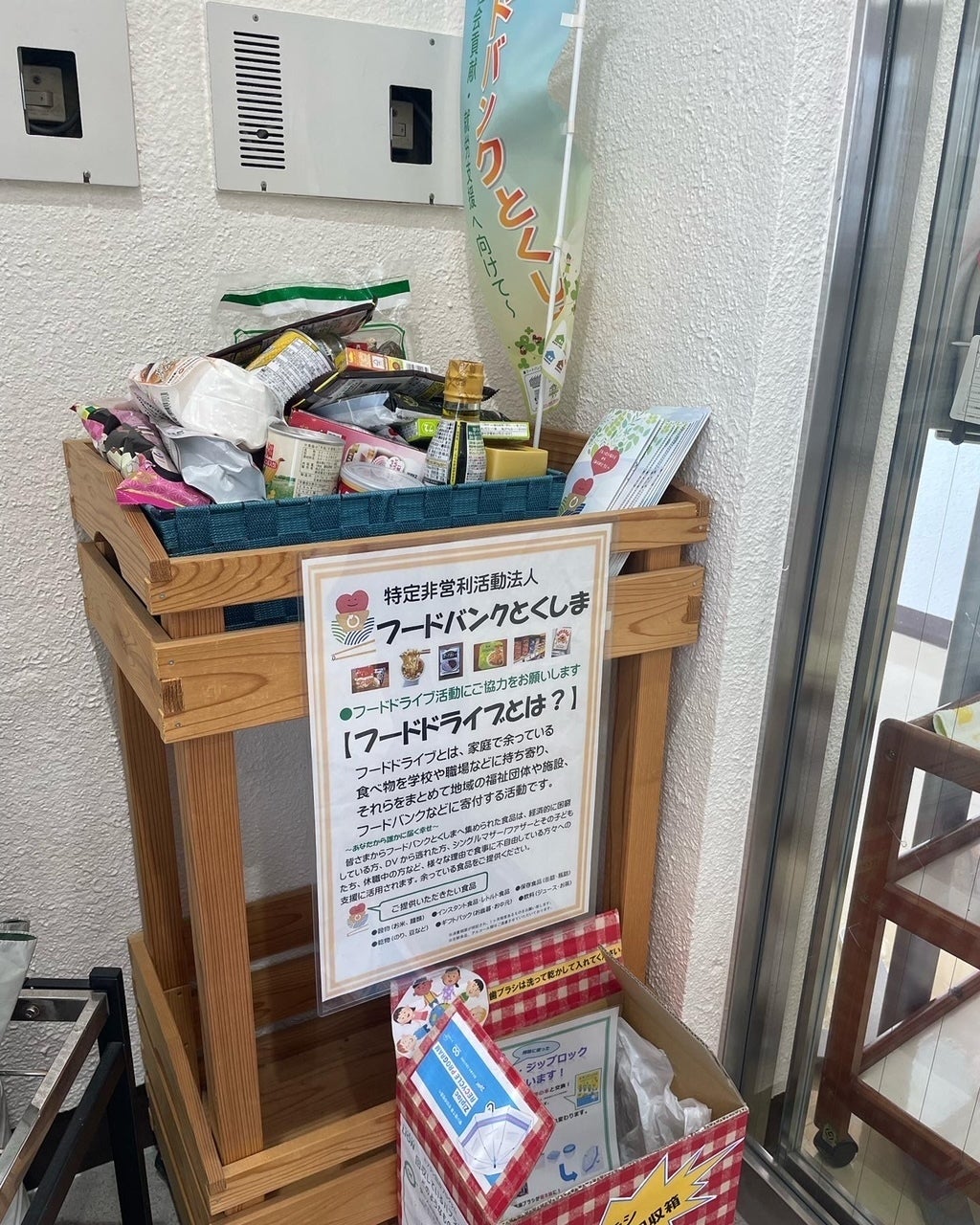 過去のフードドライブの様子。会場で集めた食料品をフードバンクとくしま様へお渡しに行った時の様子。上のカゴいっぱいになりました!!