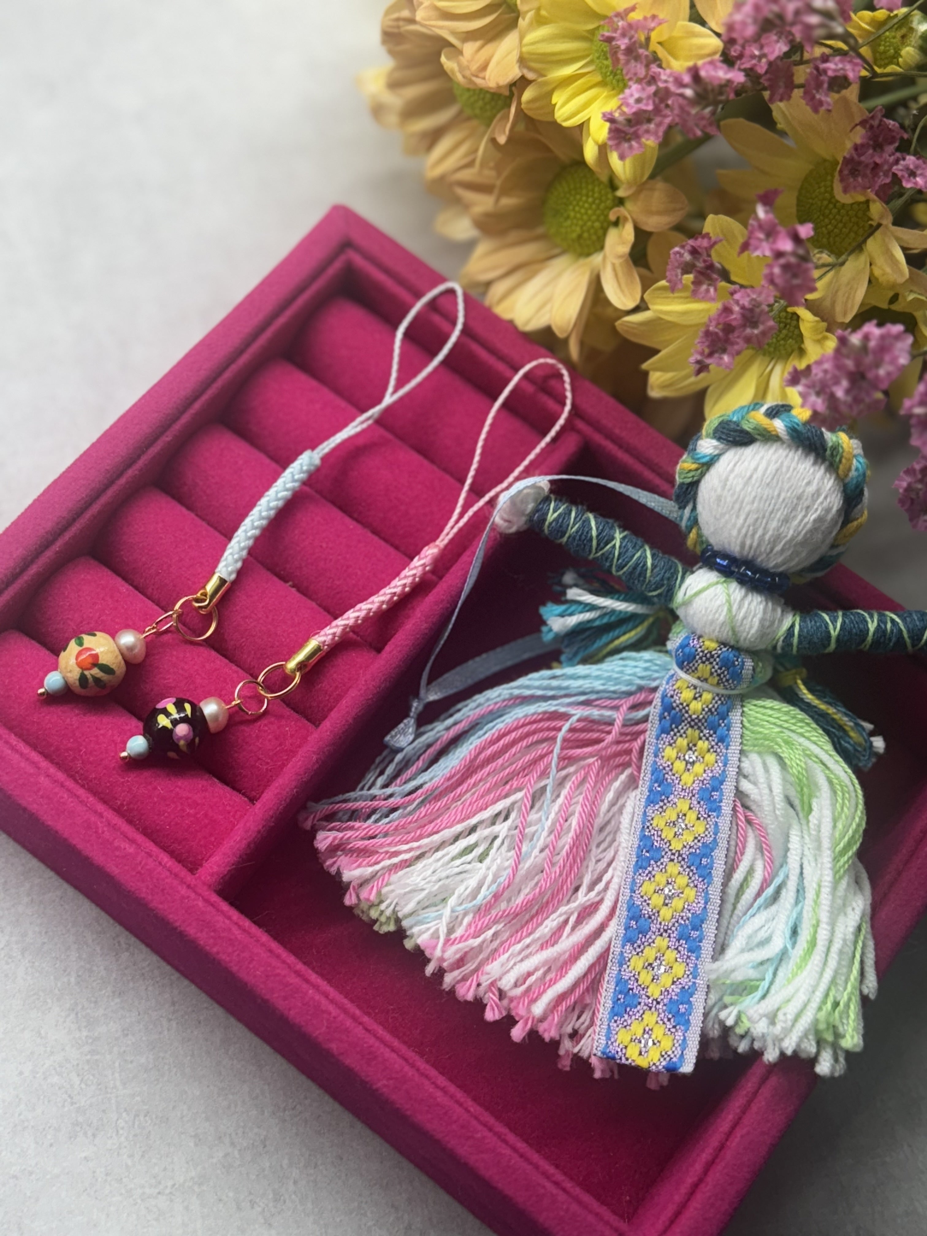 ※写真左側の水色とピンクのストラップについたものがイメージ商品です。カラーはバリエーションあり。(写真は参考に2つ並べていますが、1回のご支援につき、お1つのリターンとさせて頂きます)