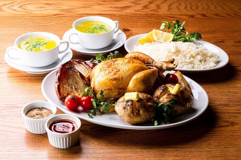 LA COCORICO(ラココリコ)自慢の『ロティサリーチキン』(ローストチキン)は銀座、上野、横浜、渋谷、浦和の各店舗内ではもちろん、テイクアウトしてご自宅やパーティー会場でお召し上がり頂けます