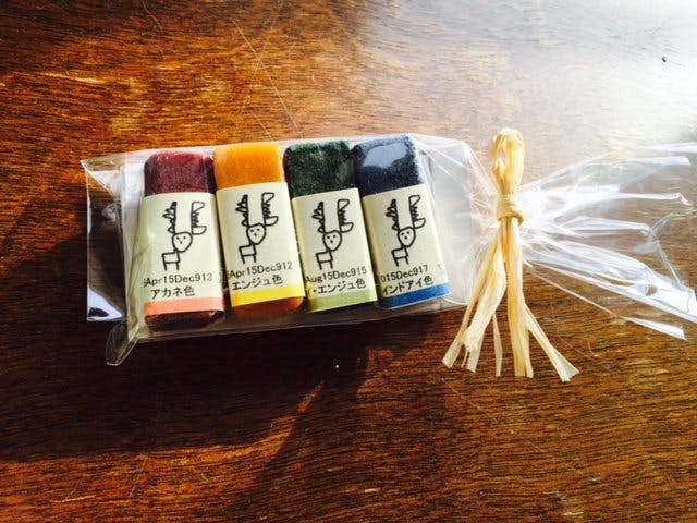 食紅等で色付けせず、植物の顔料、貝殻の粉末などを使って作られている特別なクレヨンとなります。