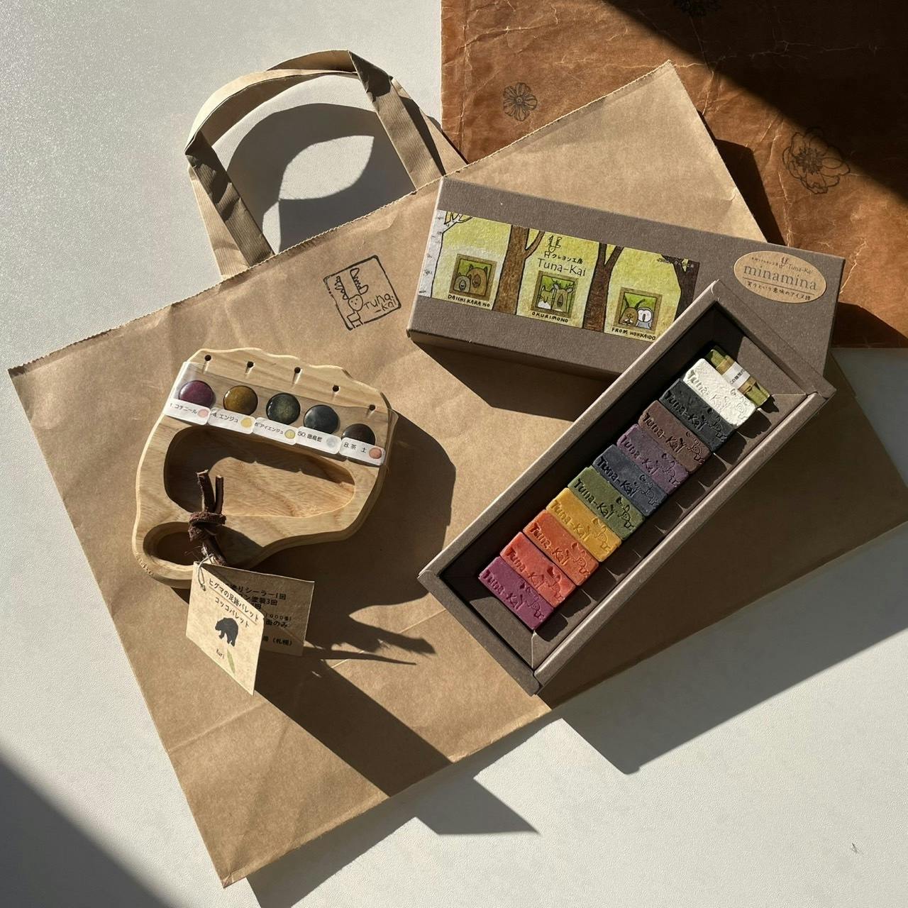 50,000円~100,000円支援くださった際には標茶町にある「手作りクレヨン工房 Tuna-Kai(トナカイ)」さんが製作しているクレヨンセット、ヒグマの足跡パレットを送らせていただきます。