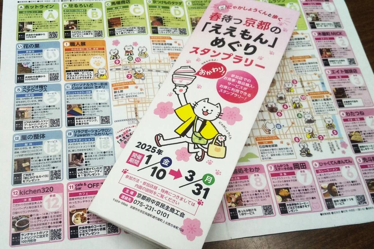 参加24店には、にゃかしょうくんスタンプを預かっていただきます。飲食から2店以上、物販またはサービスから2店以上のスタンプを集めた方には、もれなくオリジナルのにゃかしょうくんグッズ(手ぬぐい)をプレゼントします。