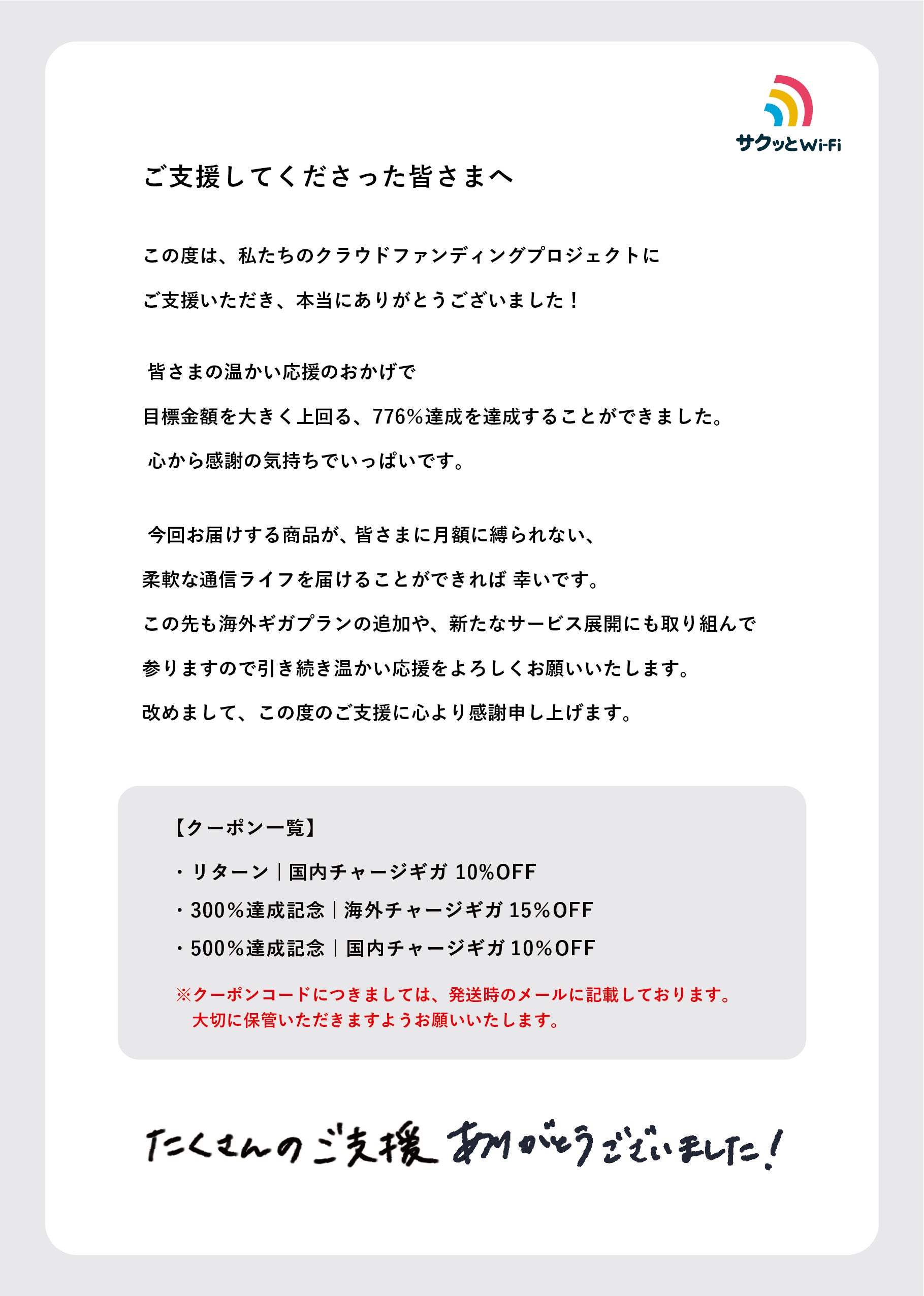 このプロジェクトは、月額費用に縛られない自由な通信ライフを提供することを目指して企画いたしました。皆さまのご支援のおかげで、この思いが形となり、多くの方にお届けできることを大変嬉しく思っています。