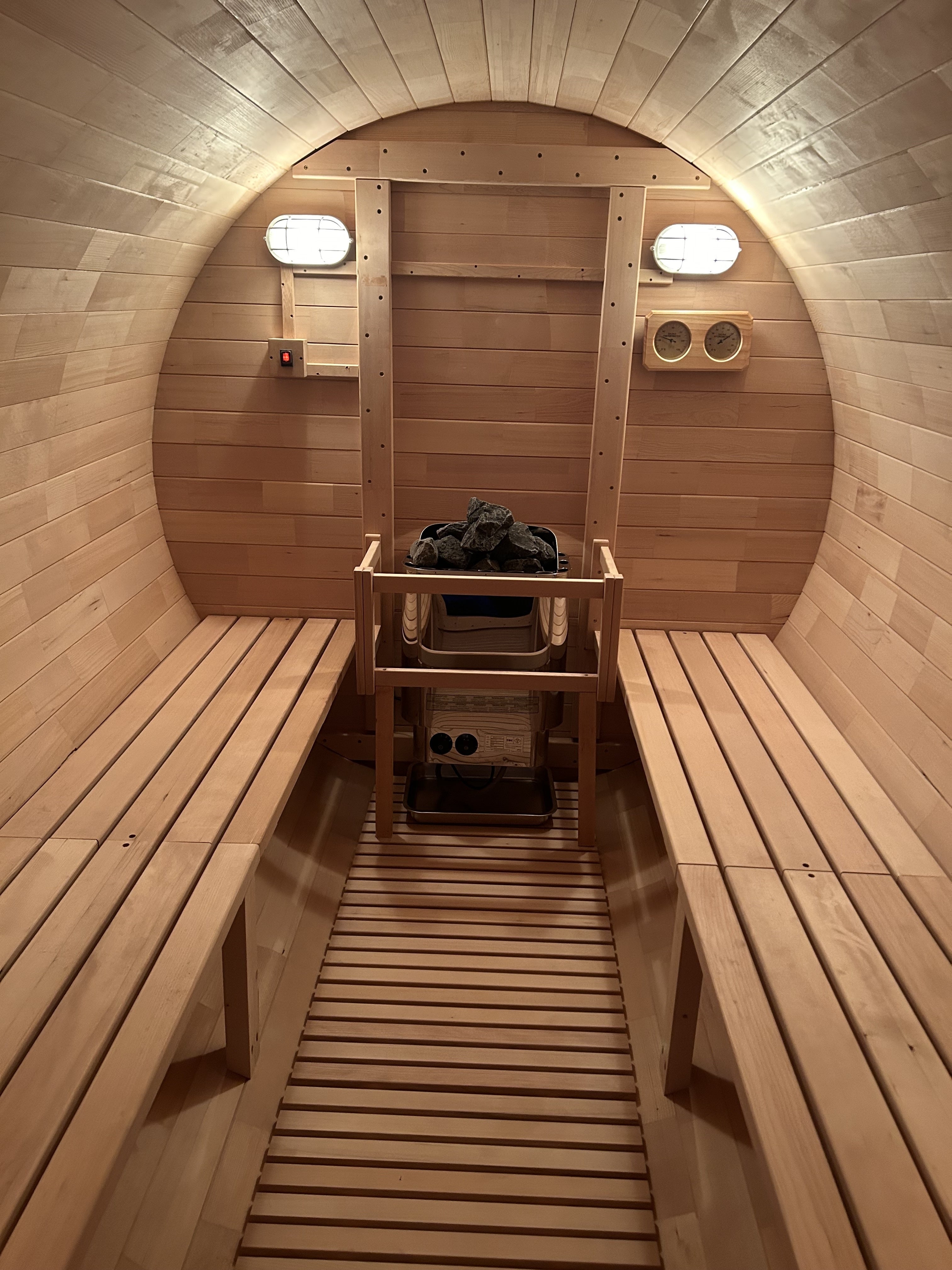 当施設で取り入れている「バレルサウナ」は熱効率に優れ、室内を均等に温める樽型構造でとても落ち着く居心地の良い空間を提供します。バレルサウナの室内温度はなんと最高で110℃にも達します。熱したサウナストーンに水をかけ、ロウリュウ式サウナを行えば、体感温度はさらに高まることでしょう。