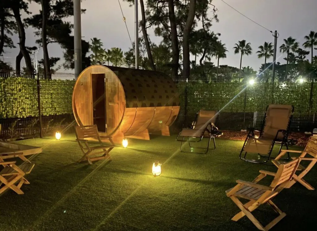 当施設で取り入れている「バレルサウナ」は熱効率に優れ、室内を均等に温める樽型構造でとても落ち着く居心地の良い空間を提供します。バレルサウナの室内温度はなんと最高で110℃にも達します。熱したサウナストーンに水をかけ、ロウリュウ式サウナを行えば、体感温度はさらに高まることでしょう。