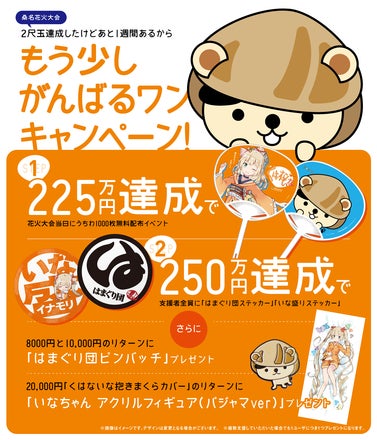 2尺玉達成したけどあと1週間あるから 「もう少しがんばるワンキャンペーン!」 STEP1:225万円達成で 2018年7月28日(土)花火大会当日に桑名でうちわ1000枚無料配布イベント! STEP2:250万円達成で 支援者全員に「はまぐり団ステッカー」「いな盛りステッカー」プレゼント! さらに!8000円と10,000円リターンに「はまぐり団ピンバッチ」追加プレゼント! 20,000円くはないな抱き枕カバーのリターンには 「いなちゃんアクリルフィギュア(パジャマver)」追加プレゼント! ※画像はイメージです。デザインは変更となる場合がございます。 ※複数支援していただいた場合でも1ユーザにつき1つプレゼントになります。 ※万が一28日が荒天で花火大会が順延になった場合は延期日(29・30日)にうちわ配布します。ここ10年以内は延期や中止はなっておりませんが、花火大会が中止の場合は、うちわ配布も中止となります。ご了承ください。 このプロジェクトは2018/07/02 23:59まで、残り1週間となってます。 桑名を盛り上げる為、新たな目標に挑戦して参ります。よろしくお願いします! くはな いな製作委員会