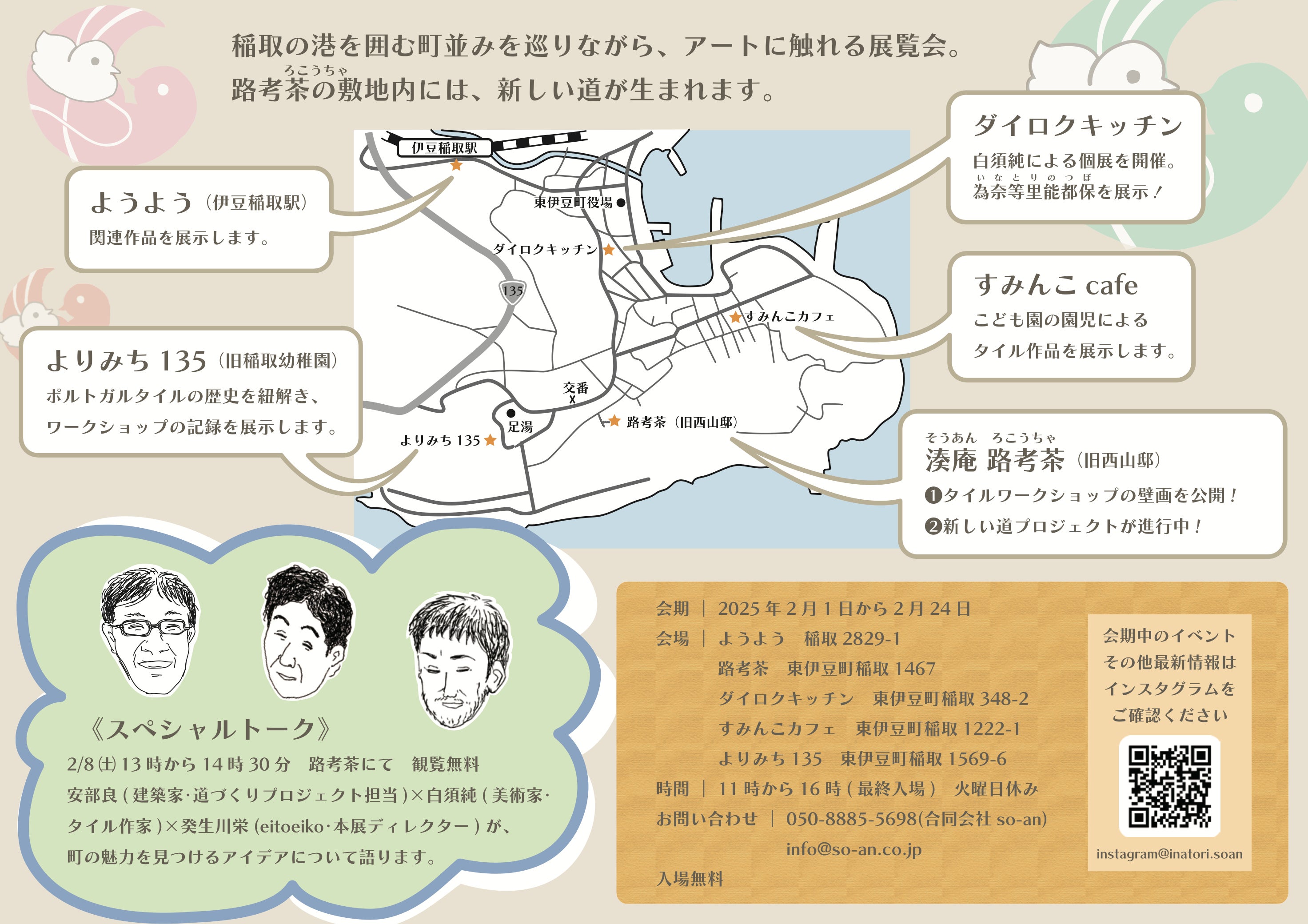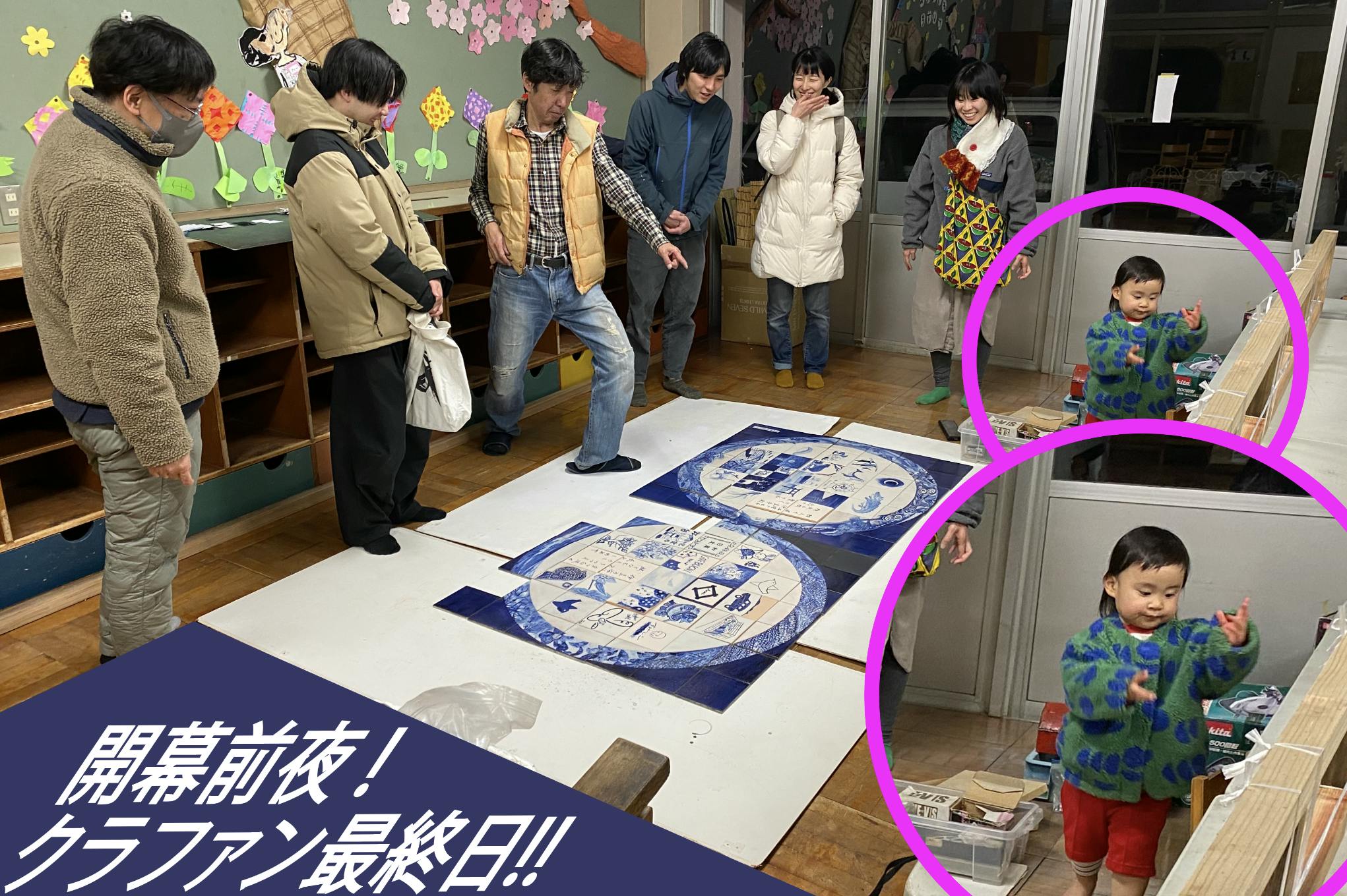 2025/01/31 20:22いよいよイナトリ・アート・フェス開催前夜となりました!つまりこのクラウドファンディングのフィナーレとなります…!10日間、早いようで早かった!笑最終日を迎えてだいぶ落ち着きましたが、この期間クラウドファンデイング運用やアートフェス準備やその他諸々の日常教務に同時進行で取り組んできました。荒武が地域おこし協力隊時代、卒業の際に地域の皆さんと全力で取り組んだ「雛フェス」以来のカオスな状況がとても懐かしかったです…!!そんなカオスな状況も一瞬にして過ぎ去り、本日1/31(金)を持って、念入りに仕込んできたクラウドファンデイングが最終日となります。すでに100名以上の方からのご支援を受けており、それだけでも十分な認知が獲得でき、お世話になっている皆さんに自分の思いを届けることができて、クラウドファンディングに取り組む価値があったなと思っていますが、ここまできたら目標金額達成したい!!やるべきことはこの記事の投稿をもってやりきったということにして、明日からのイナトリ・アート・フェスの展示内容を紹介させていただこうと思います!展示準備は今夜も進めており、完成版を拝むことができるのは、アートフェスが開幕してからとなるため、写真は在廊ボランティアのみなさんむけに開いた事前説明会の会場の写真をメインに掲載していきます。・湊庵 路考茶(もといイナトリアートセンター)メイン会場となる路考茶、徐々にアートセンターの風格を手に入れ始めました…!癸生川さんとこはくのお茶の間劇場のような写真を撮ってしまいましたが、こちらには白須さんとアズレージョワークショップに参加したみなさんの共同作品の展示や稲取の新しい道づくりのリサーチや提案資料をまとめたプレゼンテーションを展示する他、参加型企画として稲取の新しい道づくりの奇跡や路考茶建築模型制作セットのご用意、昨年の作品もします!さすがメイン会場、昨年よりもパワーアップし密度がすごいことになっています。タイミングが合えば新しい道づくりに参加ができるかも…?・ダイロクキッチンダイロクキッチンは作家、白須純氏の個展としてオープン!白と青が織りなす、白須さんの作品群をご堪能いただけます!不定期でカフェ営業も行いますので、足繁く通っていただけたらのんびりお茶も楽しむことができます!・すみんこcafe白須氏が東伊豆こども園で実施した、4〜5歳児クラスのお友達たちのタイル作品の展示を行う他、アートフェス特別スイーツのエッグタルトを焼いて「ポルトガルセット」をご用意!エッグタルト、紅茶、稲取の流し台タイルランチョンマットの3点セットで1,000円(税込)となります!そしておなじみ、東伊豆郷土カルタの詩。めちゃくちゃかっこよい第二弾が展示されていますので心して御覧ください!!!すみんこcafeでは路地裏散策を楽しみながら、カフェでまったりおくつろぎいただけたらと思います!・よりみち135(旧稲取幼稚園)よりみち135では職員室をお借りして展示がオープン!こちらでは、癸生川さんが作成したポルトガルタイルの歴史についての展示やアズレージョワークショップにサポート役で入ってくれた地域おこし協力隊の柳瀬氏が活動の軌跡をまとめた映像作品を流します。漫画調に進んでいくアズ丸の歴史紹介と、バッチリキマった柳瀬氏のアーカイブ動画の調和、お楽しみいただけること間違いなし!!・まちのレセプションようよう一年前にオープンしたまちのレセプションようようもアートフェス連携拠点に加わりました!この時期の稲取は繁忙時期ということもあって、省スペースな前年度作品を2点展示しております!電車でお越しのみなさんはようようスタッフのみなさんのご案内のもとお楽しみいただけたらと思います!ということでシンプルに説明してもこのボリューム。ご堪能いただくには1日では足りないかも?ぜひぜひイナトリ・アート・フェスをお楽しみいただけたらと思います。それでは会場でお会いしましょう!!! もっと見る