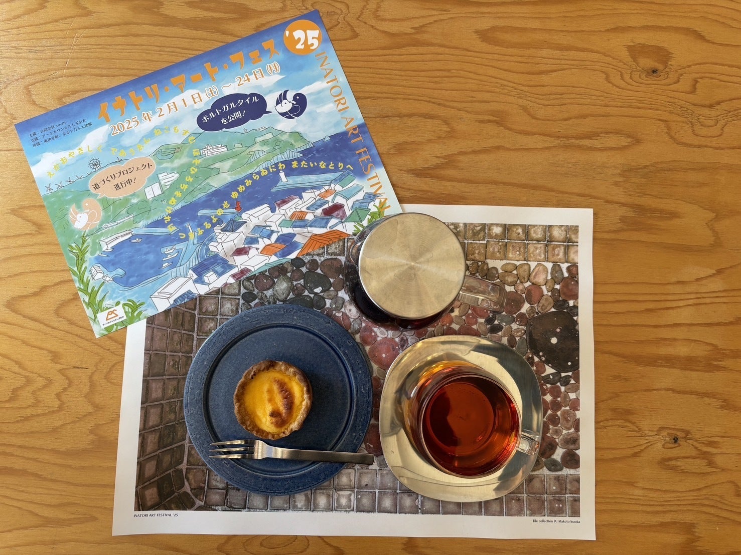 エッグタルト、紅茶、稲取の流し台タイルランチョンマットの3点セットで1,000円(税込)となります!