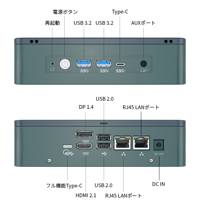 フル機能Type-Cポート、USB Type-Cポート、HDMIポート、DPポート、RJ45 LANポート×2、USB 3.2×2、USB 2.0×2、AUXポートの豊富なポートを搭載しています。マウス、キーボード、モニター、ハードディスク、プリンター等の様々な周辺機器との接続が可能で、柔軟な入出力と拡張性を備えています。