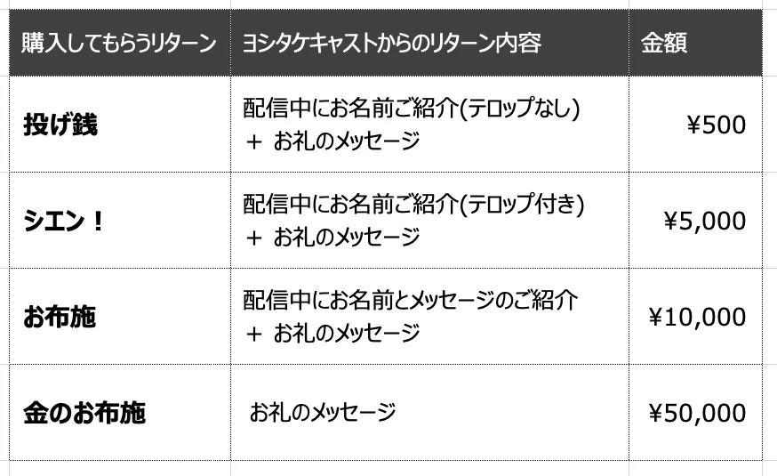 購入のリターン:配信中にお名前ご紹介(テロップなし) + お礼のメッセージ