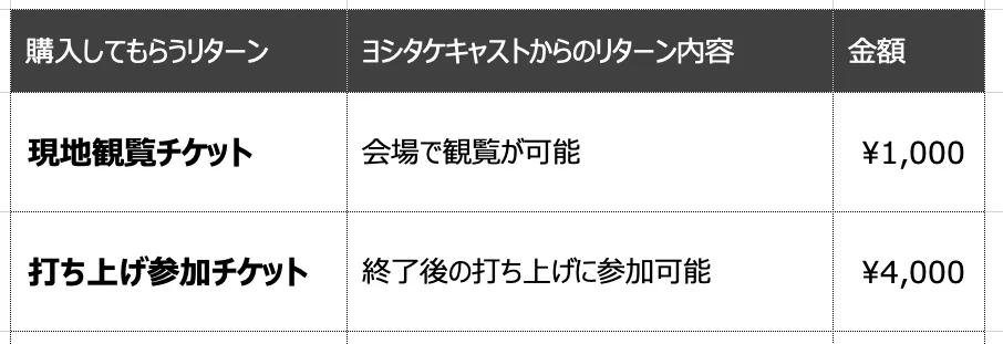 本クラウドファンディングのリターンを購入してもらうことで、イベントへの出演や、観覧・打ち上げ参加、開催の支援ができます。