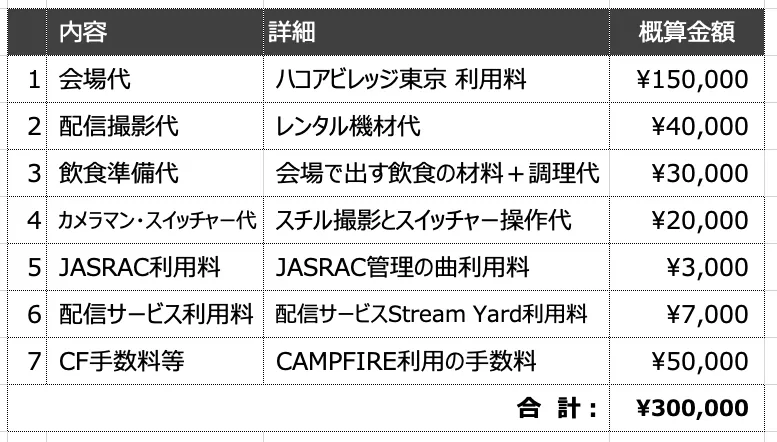 開催資金と使い道は下の通りで、約30万円かかります。