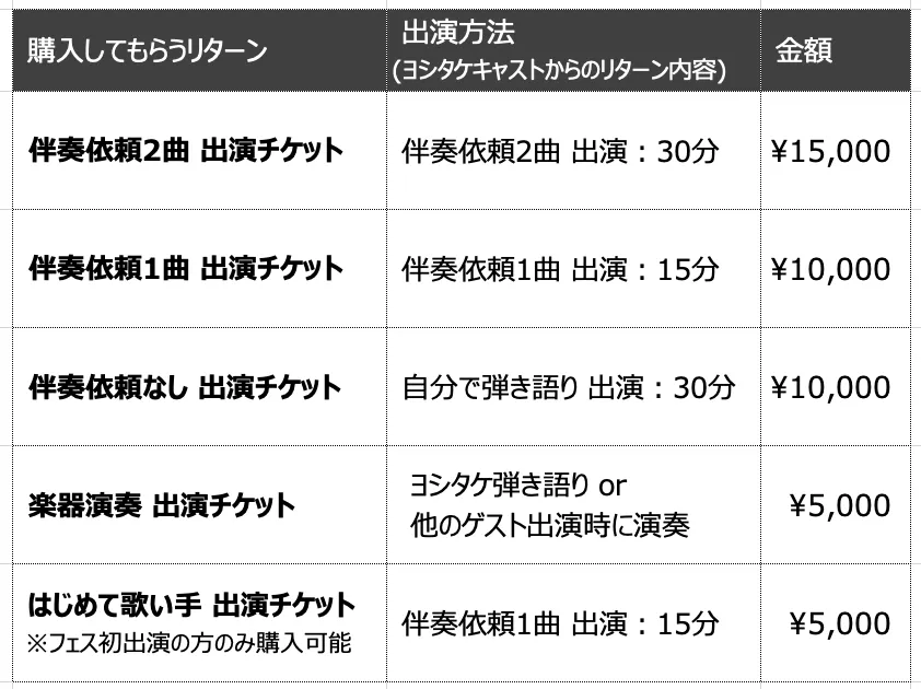 持ち時間約15分の出演枠で、ヨシタケのアコギ伴奏1曲をバックに歌って出演できます。