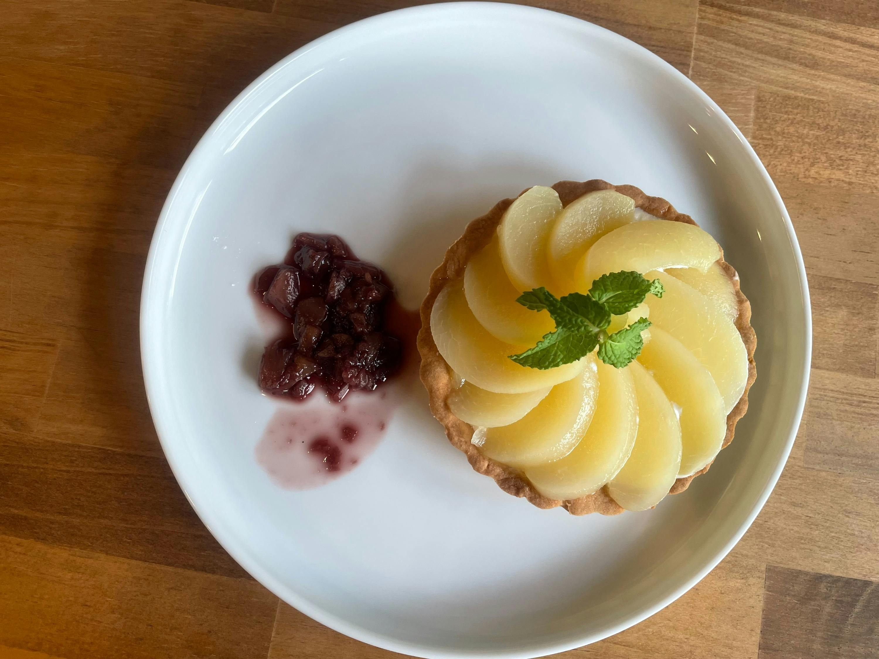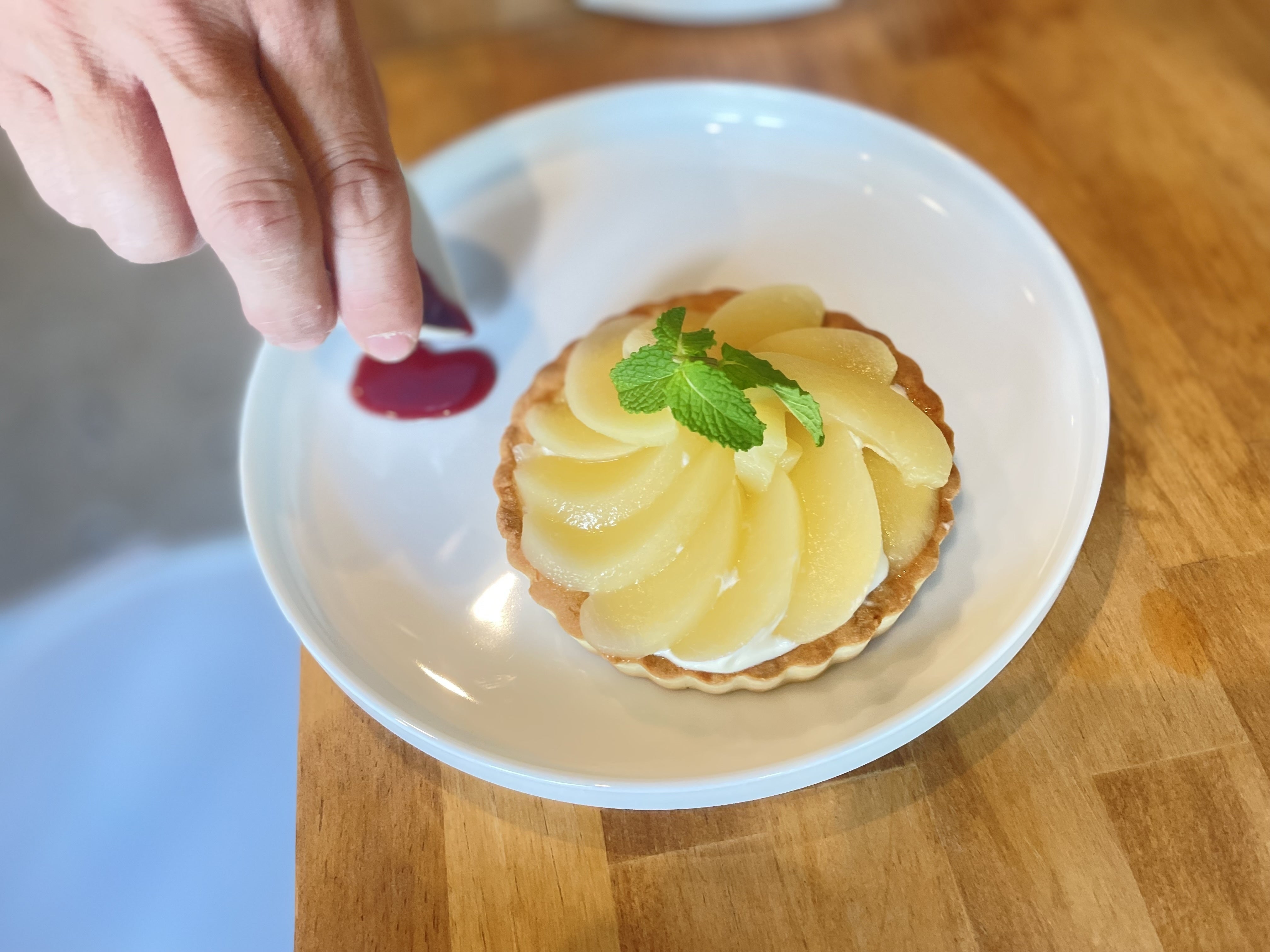 こちらも桃をまるごと1個使用した、贅沢なタルト。土台には、なんとピザ用の粉を使って一から手づくりした、オリジナルのタルト生地を使っています。サクッと香ばしい食感と、ジューシーな桃の甘さが広がる、こだわりの一品です。