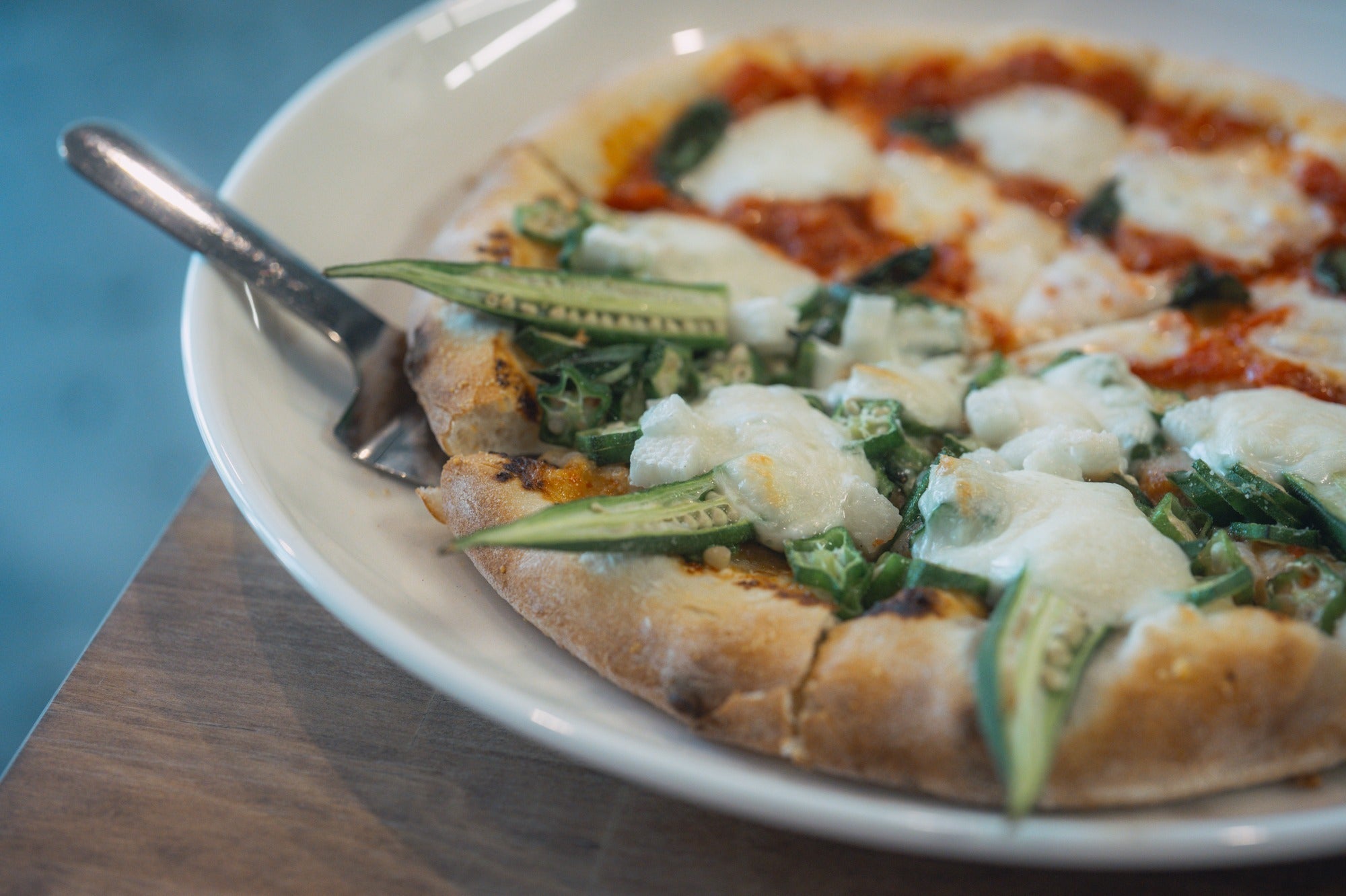 完熟の桃をまるごと1個贅沢に使った、夏限定の特製ピザです。ベースには、ヨーグルトとマスカルポーネを合わせた爽やかなクリームを使用。フルーティーな甘さと、ミントの香り、ほんのり塩気のある生地が絶妙にマッチし、デザート感覚でも楽しめる一枚に仕上がりました。