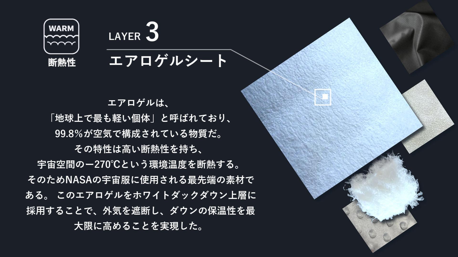 エアロゲルは、約90%が空気で構成された”個体”で非常に低密度で空気の層を備えた物質であり断熱性が
