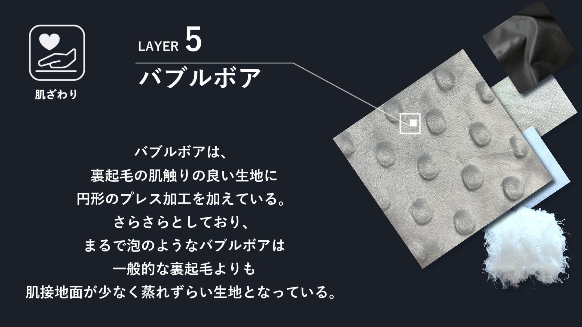 バブルボアの特殊な繊維構造が体温をしっかりと閉じ込め、冷気をシャットアウトします。