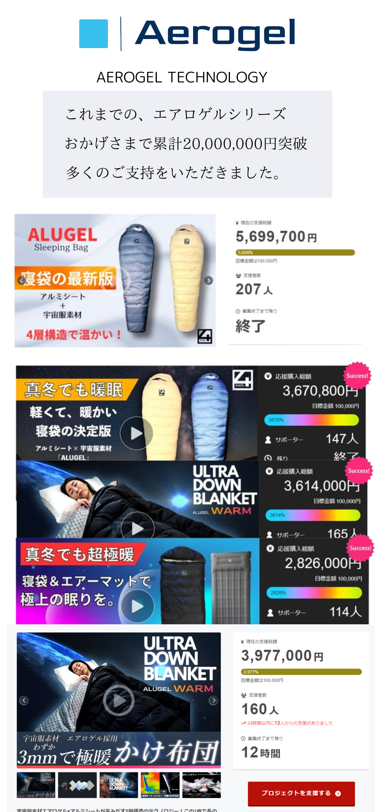 2025/02/18 18:00この度は《宇宙服素材エアロゲルウルトラダウンブランケット》ご支援をいただきありがとうございました。サポーター様へのリターンの発送が完了しております。商品に関しまして何かございましたら、下記問い合わせ窓口のメールアドレスまでご連絡ください。■ お問い合わせ窓口:4inchinc@gmail.com--------------------------------------------------【ブランケットの暖かさはいかがでしょうか?】\ぜひ商品に関するみなさまのお声お聞かせください!/ULTRA DOWN BLANKET【商品レビューを記載する♪】みなさまからの貴重なご意見をリターンのブラッシュアップや事業の改善に活かして参ります。ご協力のほど、何卒よろしくお願いいたします。ー 4inch.プロジェクトチーム ー////////【公式LINE】////////【 https://lin.ee/LmAcElk 】●「日頃の感謝を込めて。」\オンラインストア/初回限定!¥2000円OFFクーポン配布中!(全商品対象)(※公式LINEお友達登録にて皆様お使いいただけます。)●アフターサポートも公式LINEにて承っております。////////【公式Instagram】////////【 https://www.instagram.com/_4inch_/ 】\日々商品開発や極寒実験の様子などを気軽にアップしています♪/★『フォロー&いいね』でプレゼント企画随時実施中!【寝袋やエアピローなどのキャンプグッズが当たります!】////////【オンラインストア】////////【 https://4inch.store/ 】\NASA宇宙服断熱素材「エアロゲル」を採用の寝袋やブランケットなどを展開しています!/LINEクーポン配布中で全商品2000円OFF割引あり!(※初回限定クーポンとなります。) もっと見る【残り6時間でプロジェクト終了】誠にありがとうございます。