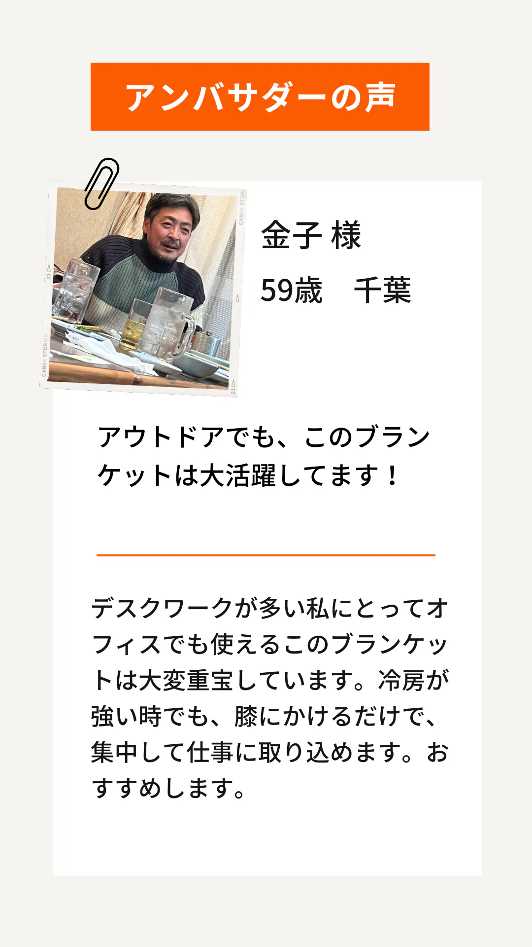 2025/02/18 18:00この度は《宇宙服素材エアロゲルウルトラダウンブランケット》ご支援をいただきありがとうございました。サポーター様へのリターンの発送が完了しております。商品に関しまして何かございましたら、下記問い合わせ窓口のメールアドレスまでご連絡ください。■ お問い合わせ窓口:4inchinc@gmail.com--------------------------------------------------【ブランケットの暖かさはいかがでしょうか?】\ぜひ商品に関するみなさまのお声お聞かせください!/ULTRA DOWN BLANKET【商品レビューを記載する♪】みなさまからの貴重なご意見をリターンのブラッシュアップや事業の改善に活かして参ります。ご協力のほど、何卒よろしくお願いいたします。ー 4inch.プロジェクトチーム ー////////【公式LINE】////////【 https://lin.ee/LmAcElk 】●「日頃の感謝を込めて。」\オンラインストア/初回限定!¥2000円OFFクーポン配布中!(全商品対象)(※公式LINEお友達登録にて皆様お使いいただけます。)●アフターサポートも公式LINEにて承っております。////////【公式Instagram】////////【 https://www.instagram.com/_4inch_/ 】\日々商品開発や極寒実験の様子などを気軽にアップしています♪/★『フォロー&いいね』でプレゼント企画随時実施中!【寝袋やエアピローなどのキャンプグッズが当たります!】////////【オンラインストア】////////【 https://4inch.store/ 】\NASA宇宙服断熱素材「エアロゲル」を採用の寝袋やブランケットなどを展開しています!/LINEクーポン配布中で全商品2000円OFF割引あり!(※初回限定クーポンとなります。) もっと見る【残り6時間でプロジェクト終了】誠にありがとうございます。