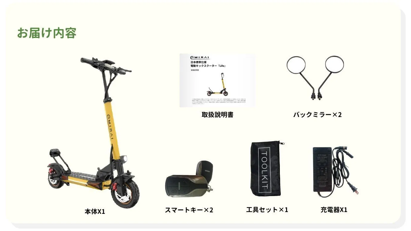 イープラスミライが販売するすべての電動モビリティは、お客様が業者に依頼することなく、維持費を節約できるように設計されています。外装部品の90%は簡単に交換できるため、工賃が不要で、維持費を大幅に抑えることが可能です。このように、お客様にとって最も喜ばれる仕組みを実現し、日常のメンテナンスを気軽に行えるよう配慮しています。これこそが電動モビリティの本来あるべき姿です。【Life】は、その理念を体現した、経済的で使いやすい電動キックスクーターです。そして、【Life】を購入されたお客様に、より安心してご利用いただけるよう、万が一の修理が必要な際は、製品を日本工場に送っていただければ、メーカーが直接対応いたします。このサービスにより、専門スタッフによる確実な修理をお約束し、長く安心して【Life】をご愛用いただけるよう、最高のアフターサービスをご提供し、常に信頼いただけるパートナーであり続けたいと考えております。