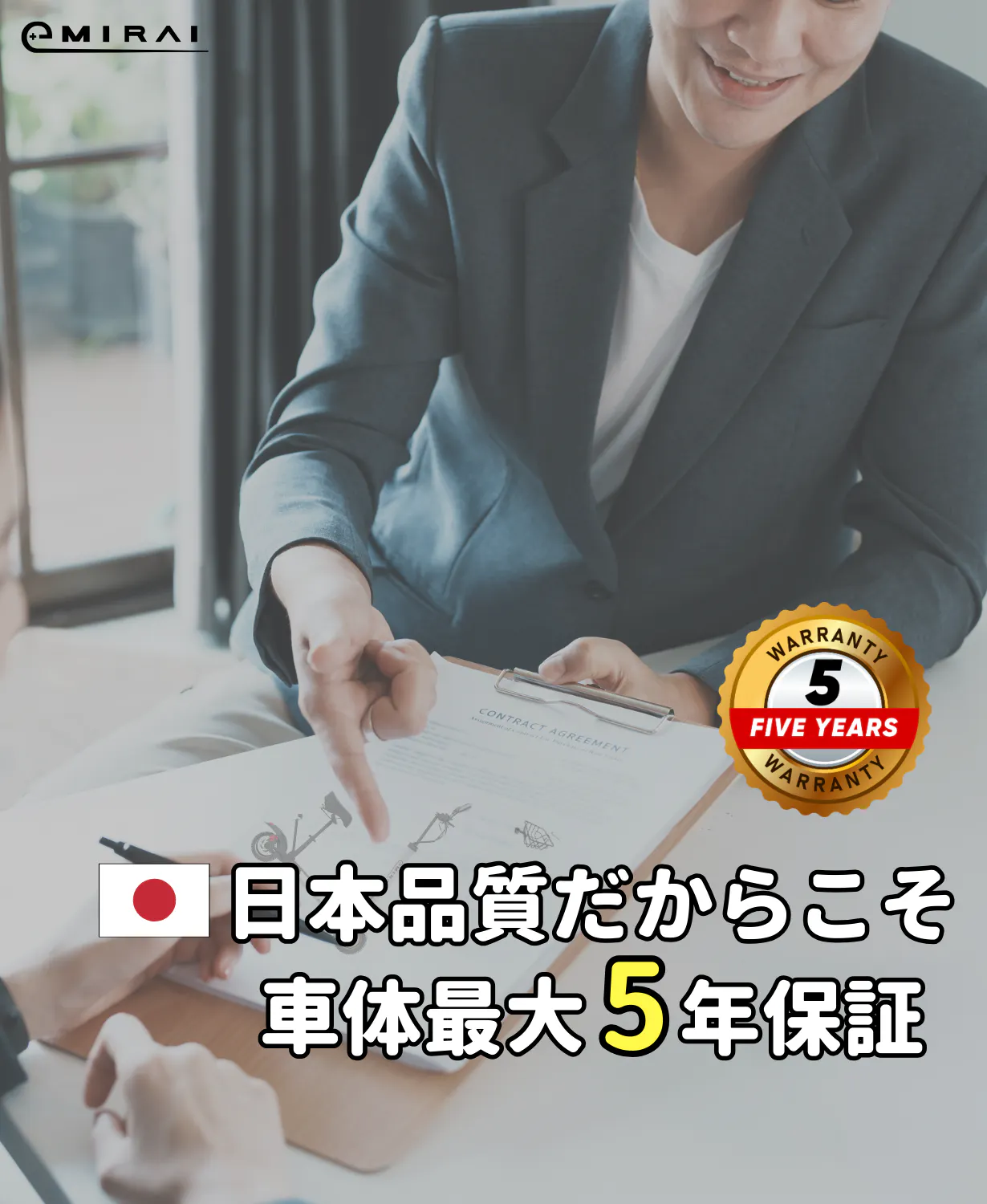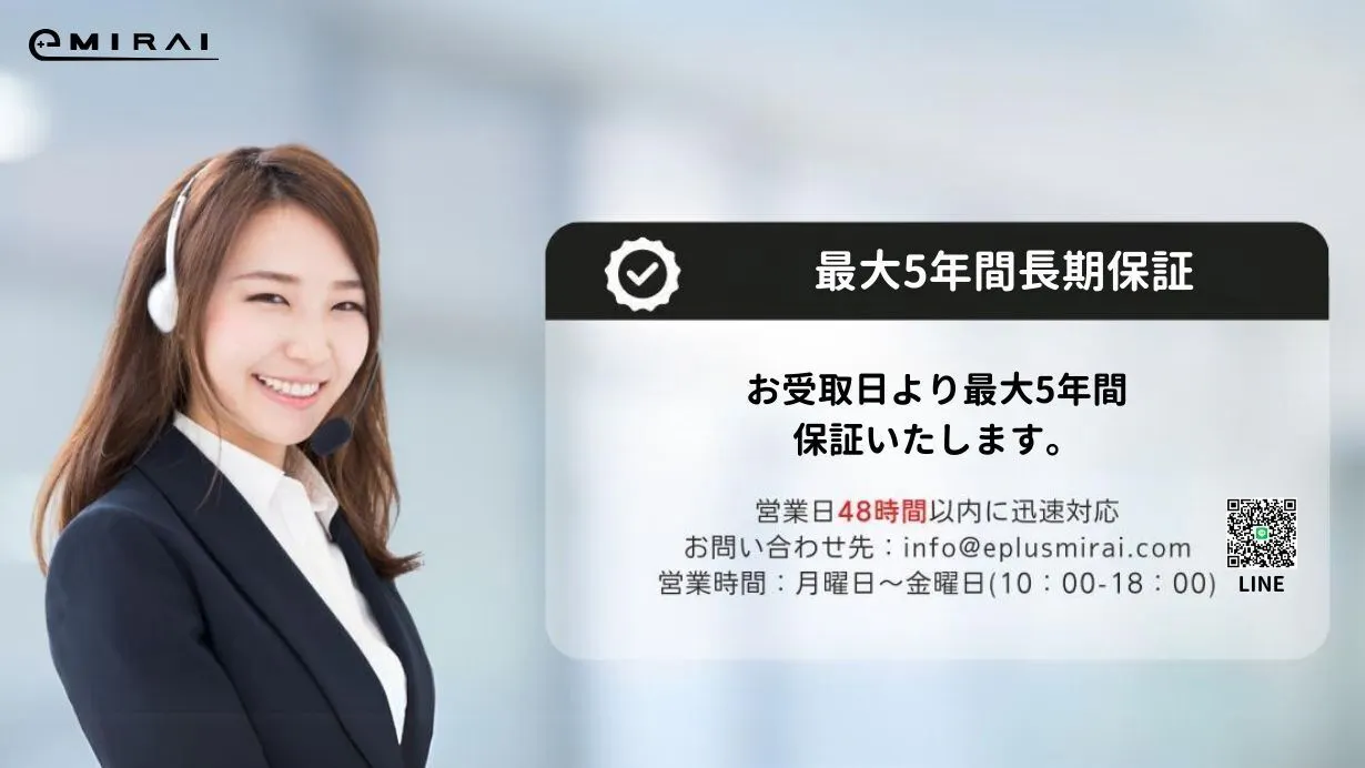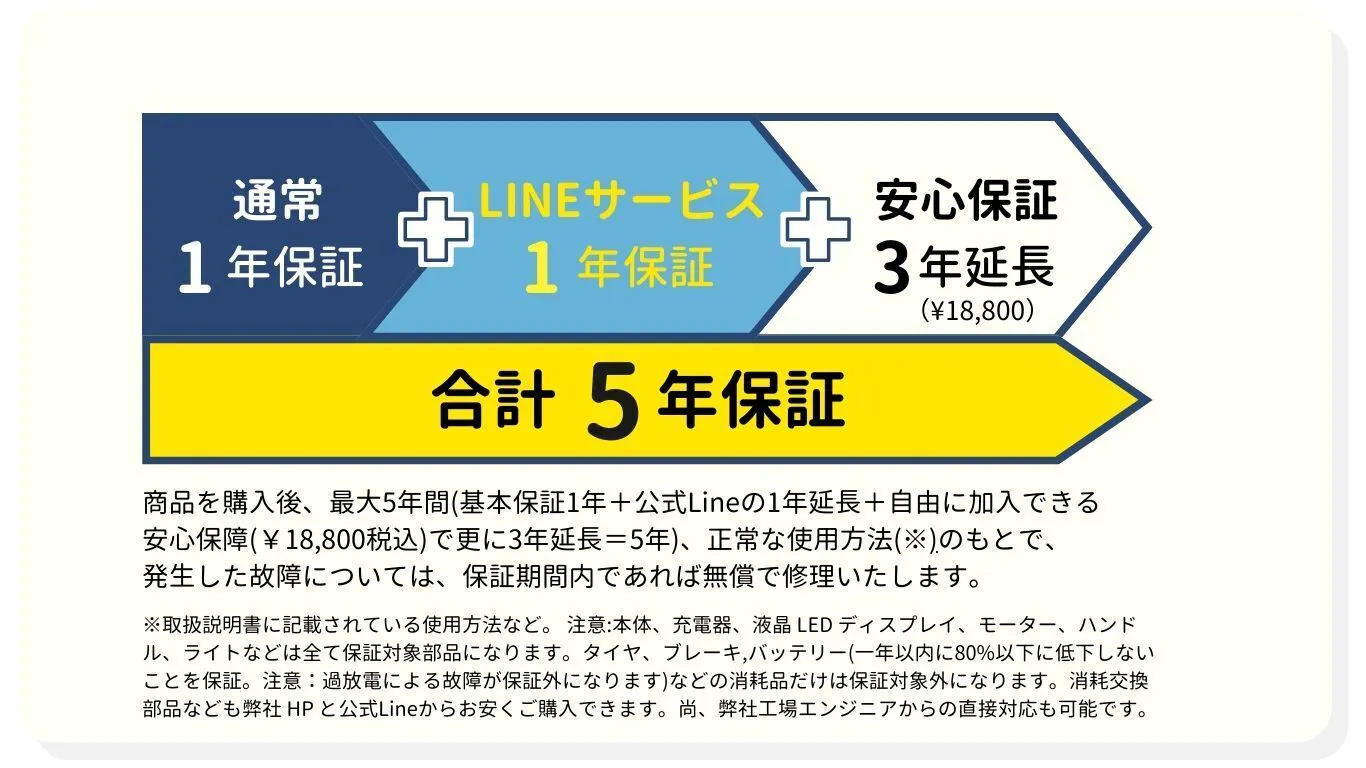高い品質を提供出来る様、イープラスミライ は高強度アルミ合金車体を採用し、厳しい検品基準で検査を行っています。電気用品安全法を遵守し、充電器とバッテリーには PSE マークを取得しています。且つ、出荷前に91項目の車体の点検を行うことで、イープラスミライならではの日本製の高い品質を提供いたします。 商品を購入後、最大5年間(基本保証1年+公式Lineの1年延長+自由に加入できる安心保障(¥18,800税込)で更に3年延長=5年)、正常な使用方法(※)のもとで、発生した故障については、保証期間内であれば無償で修理いたします。