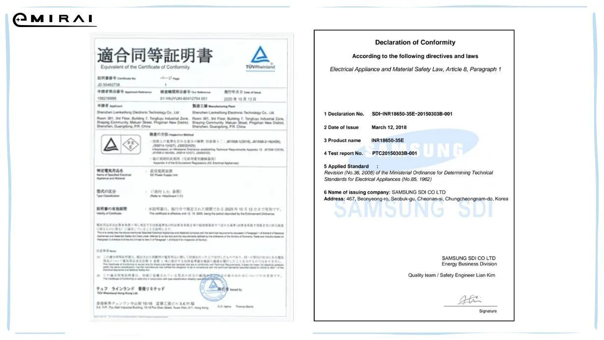 安全認証PSEを取得された正規韓国SAMSUNG製のリチウムイオン電池を採用。万一の時に備えて、お客様への補償をカバーするためのPL保険にも加入済。