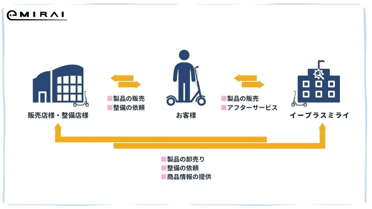 私たちイープラスミライは、未来の移動手段をより身近で快適にすることを目指し、日本で電動モビリティの革新を推進しています。この革新の波を全国に広げるため、一緒に未来を切り開いていく販売パートナー様・整備店様を募集中です。 自動車ディーラー、バイクショップ、自転車販売店、個人事業主など、業界を問わずご参加いただけます。イープラスミライでは、最先端の電動キックスクーターや電動バイクを扱っていただくだけでなく、新たな市場を共に創り出すパートナーとして、皆様と共に成長していきたいと考えています