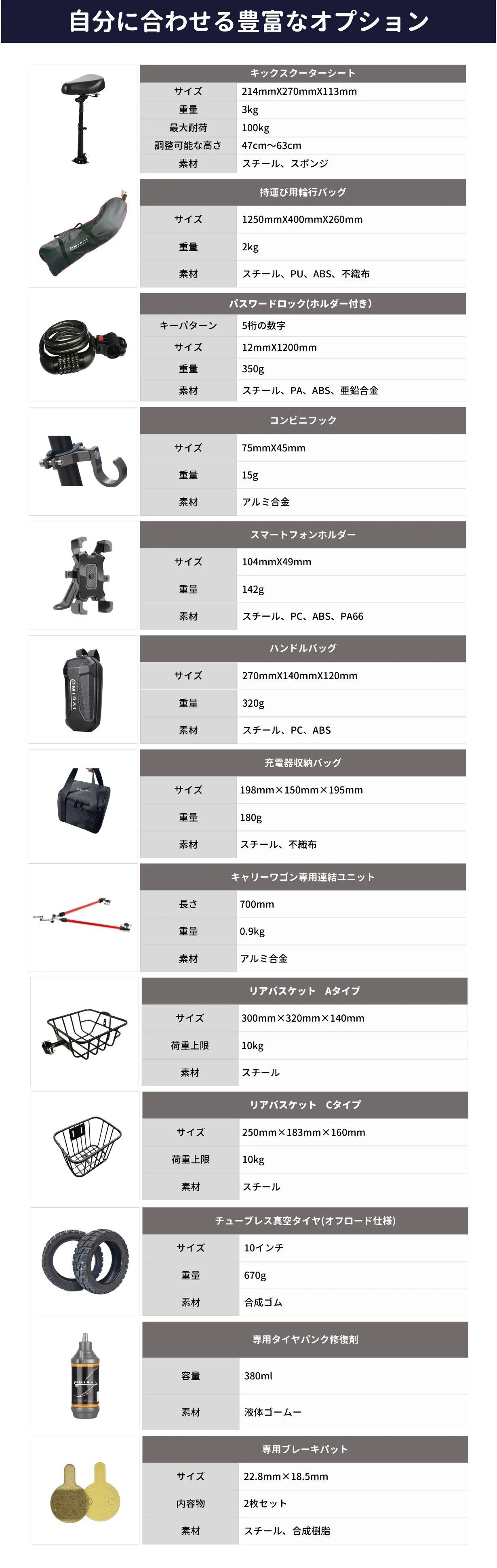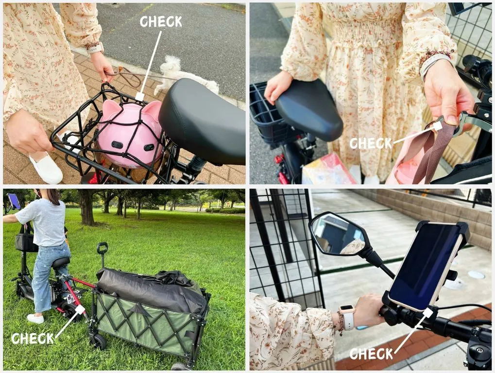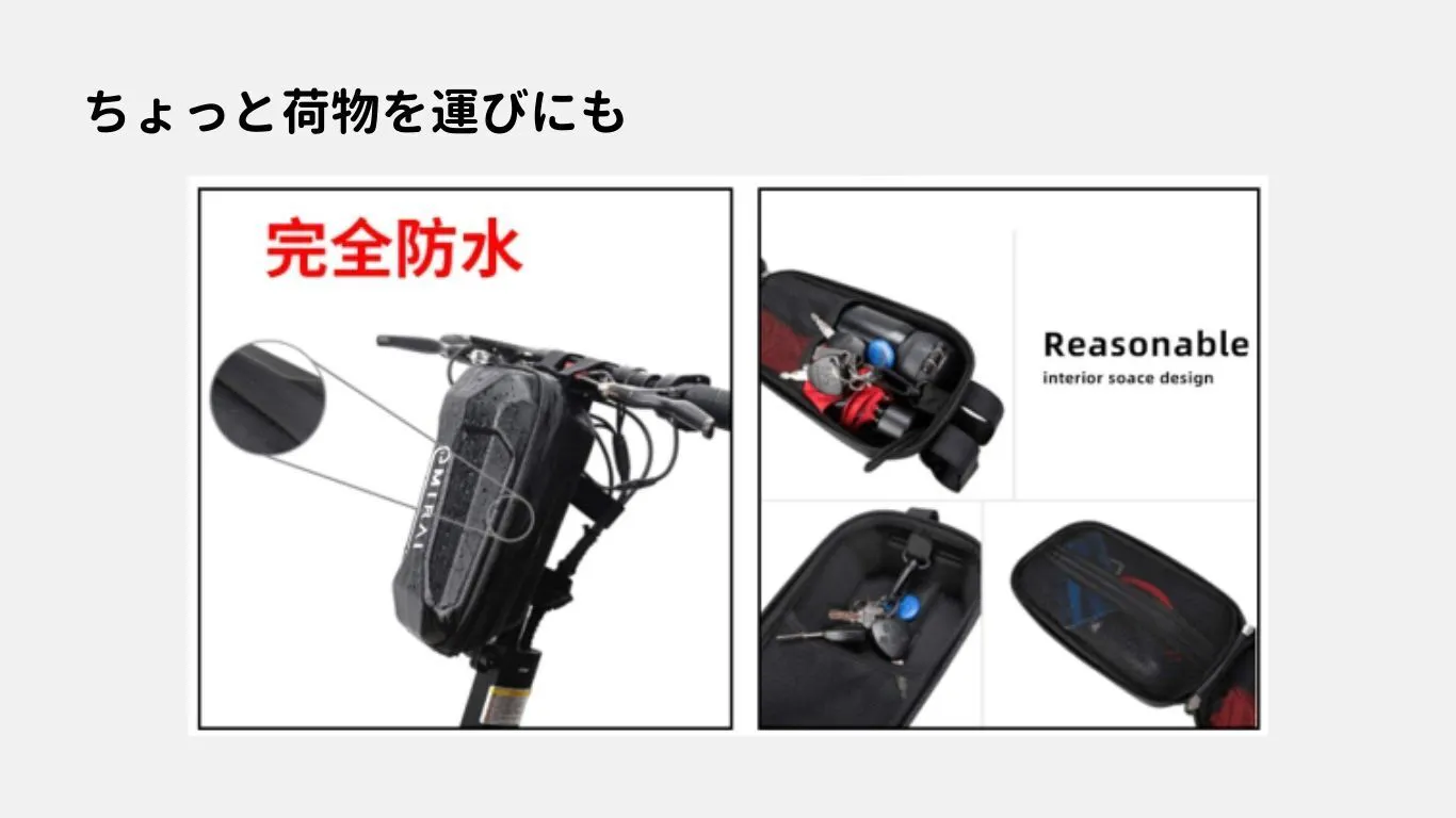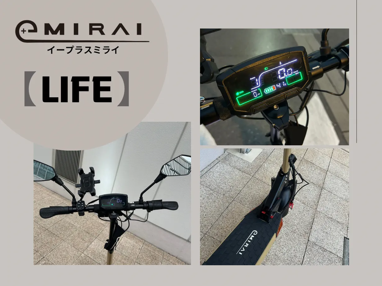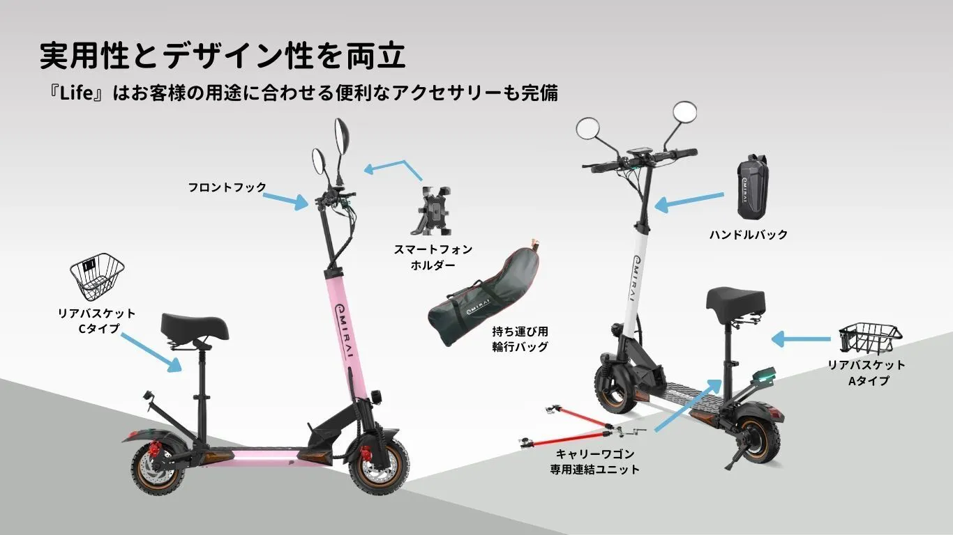 イープラスミライの電動キックスクーター【Life】は豊富なオプションを備え、通勤、買物、アウトドアなどあらゆる使用場面でユーザーのニーズに応えます。