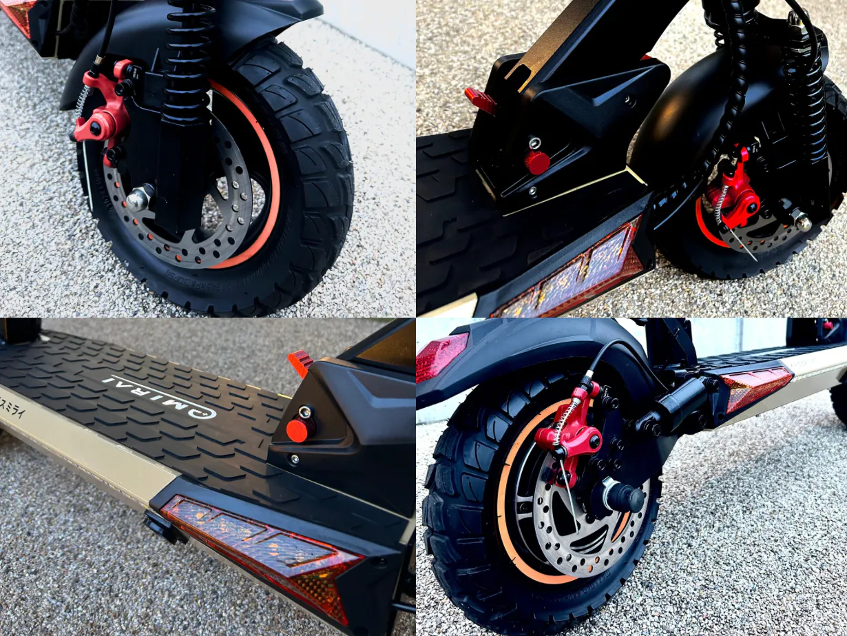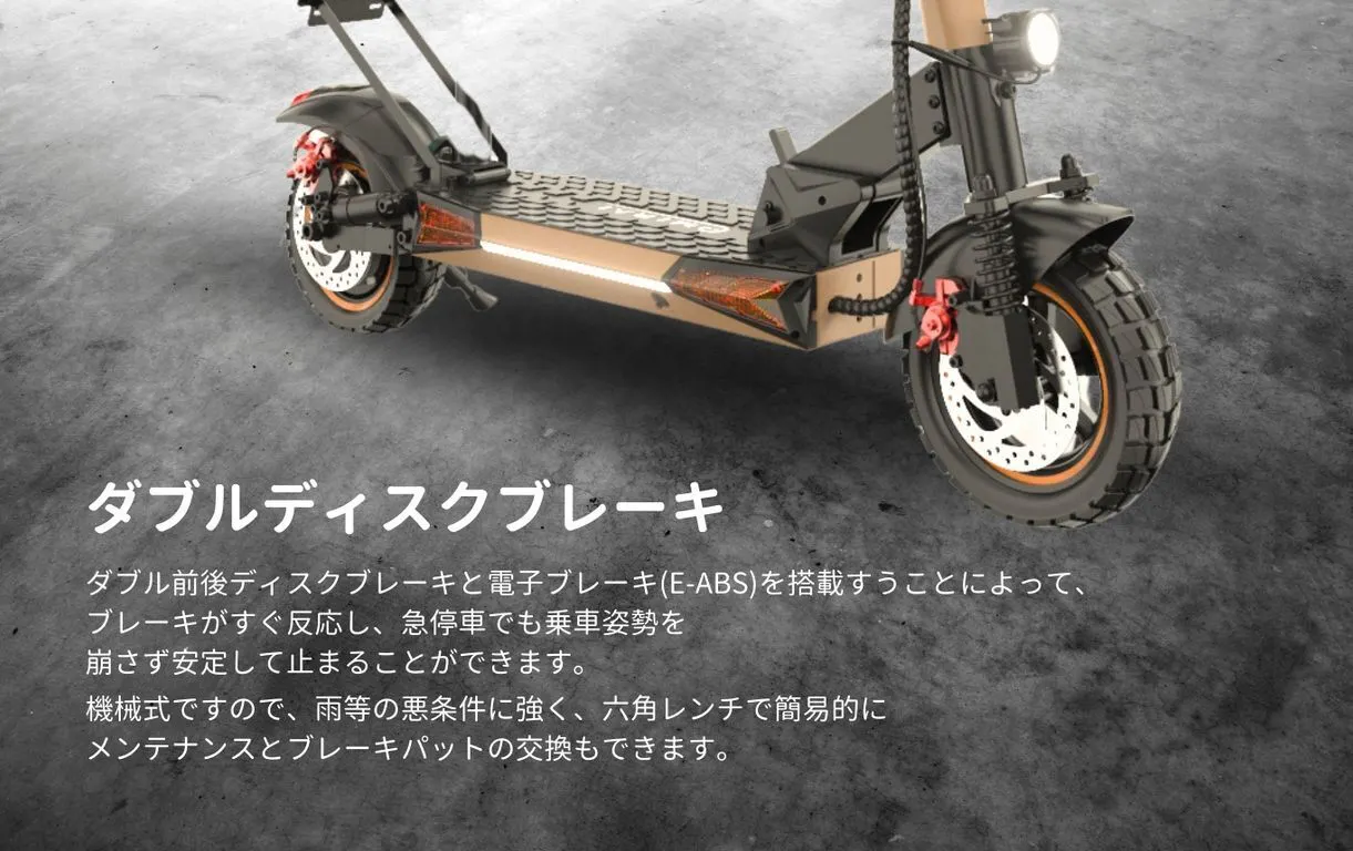 【LIFE】は走行時に発生する路面からの振動をしっかり吸収してくれるクッション性の高い大径10インチのチューブレスオフロード真空タイヤ(自動車のタイヤと同じなタイプ)を採用しております。舗装道路はもちろん、砂利道や未舗装の道路でも安定した走行が可能です。耐久性とトラクション性能が高く、快適でより安全な乗り心地を提供します。どんな路面でもスムーズに移動できるため、通勤やレジャー、冒険心をくすぐる旅行など、さまざまな応用シーンの路面状況で優れた駆動力や制動力が発揮できます。 悪天候や濡れた道路などで路面状態が悪くても、効果的にスリップを防いでくれます。 ※チューブレスタイヤは釘や鋭利な破片を踏んでも一気に空気が抜けにくくなっています。チューブタイヤに比べて、タイヤにダメージがあってもすぐにパンクせず、ある程度は走行が続けられます。スリップや転倒等の予期せぬ事故を予防できます。※悪天候での走行は、安全に十分気を配り、スピードを落として走行して下さい。
