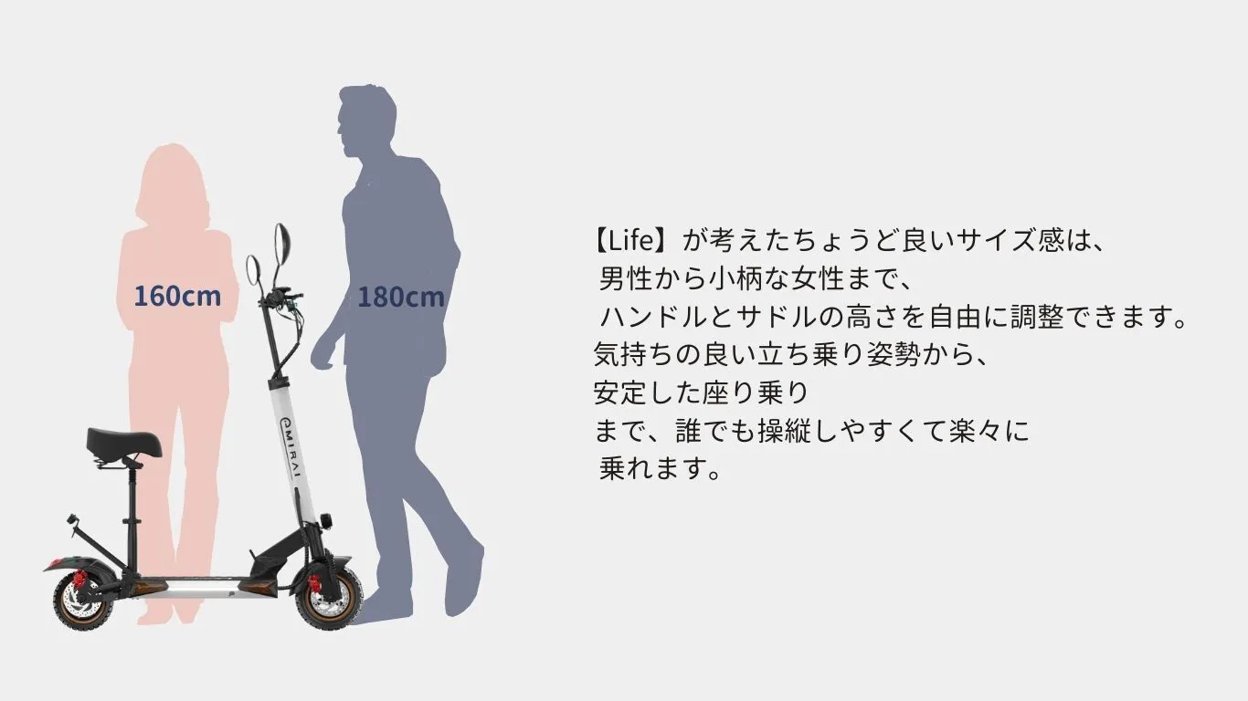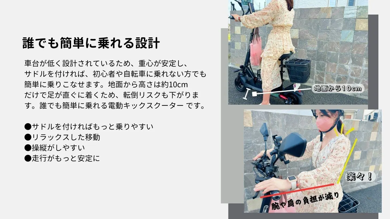 【LIFE】は車台が低く設計されているため、重心が安定し、サドルを付ければ、初心者や自転車に乗れない方でも簡単に乗りこなせます。地面から高さは約10cmだけで足が直ぐに着くため、転倒リスクも下がります。誰でも簡単に乗れる電動キックスクーター です。