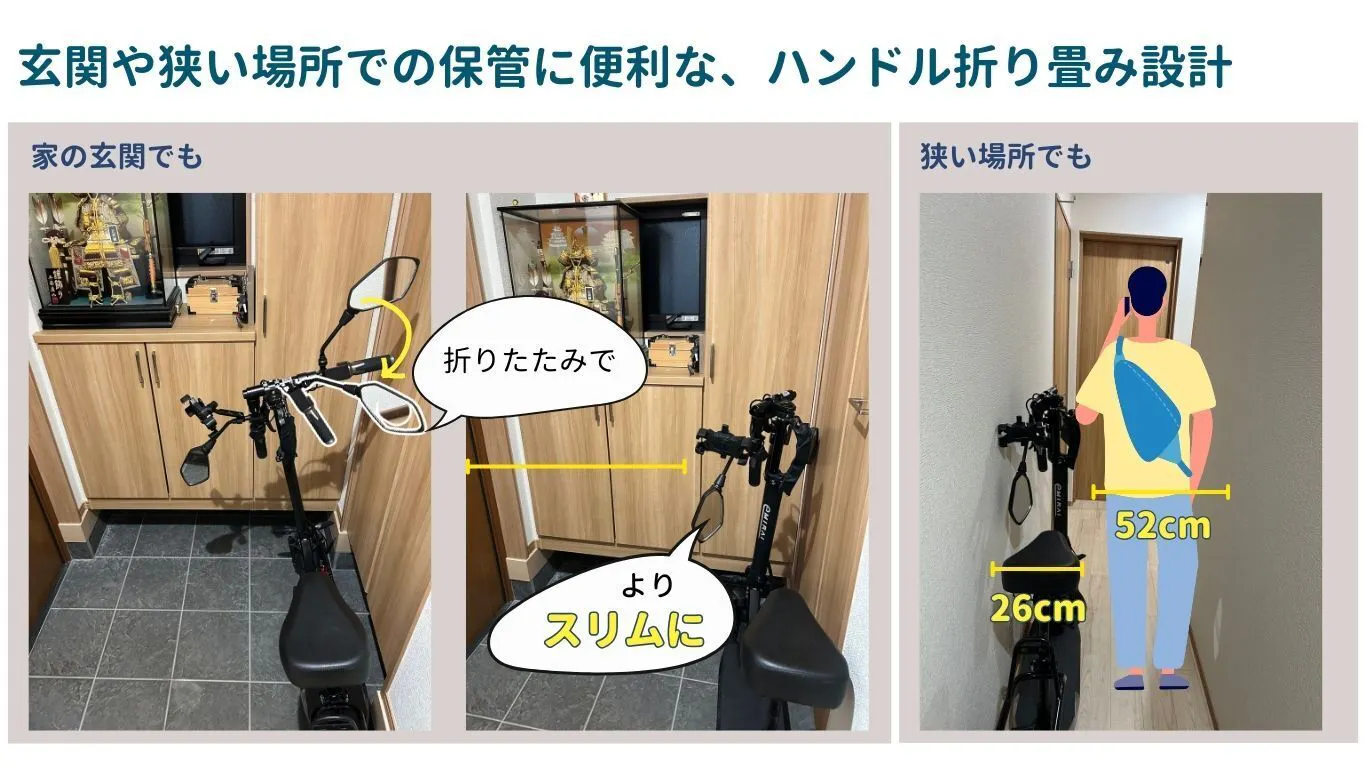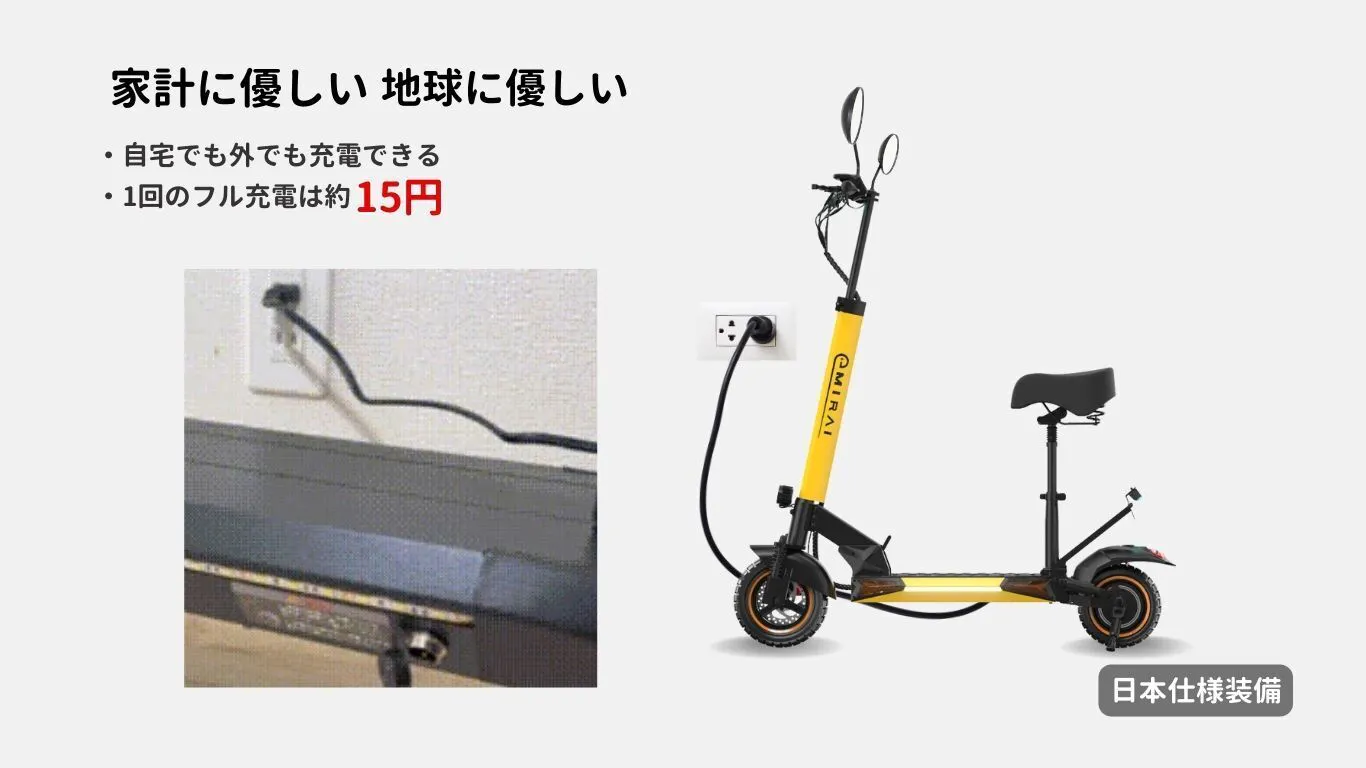 ■省エネで家計に優しい 駐車場は要らず、室内でも簡単に収納出来ます。手軽に自宅や外出先で充電でき、一回のフル充電は約5時間。電気代は約15円程度の為、家計にとても優しいです。