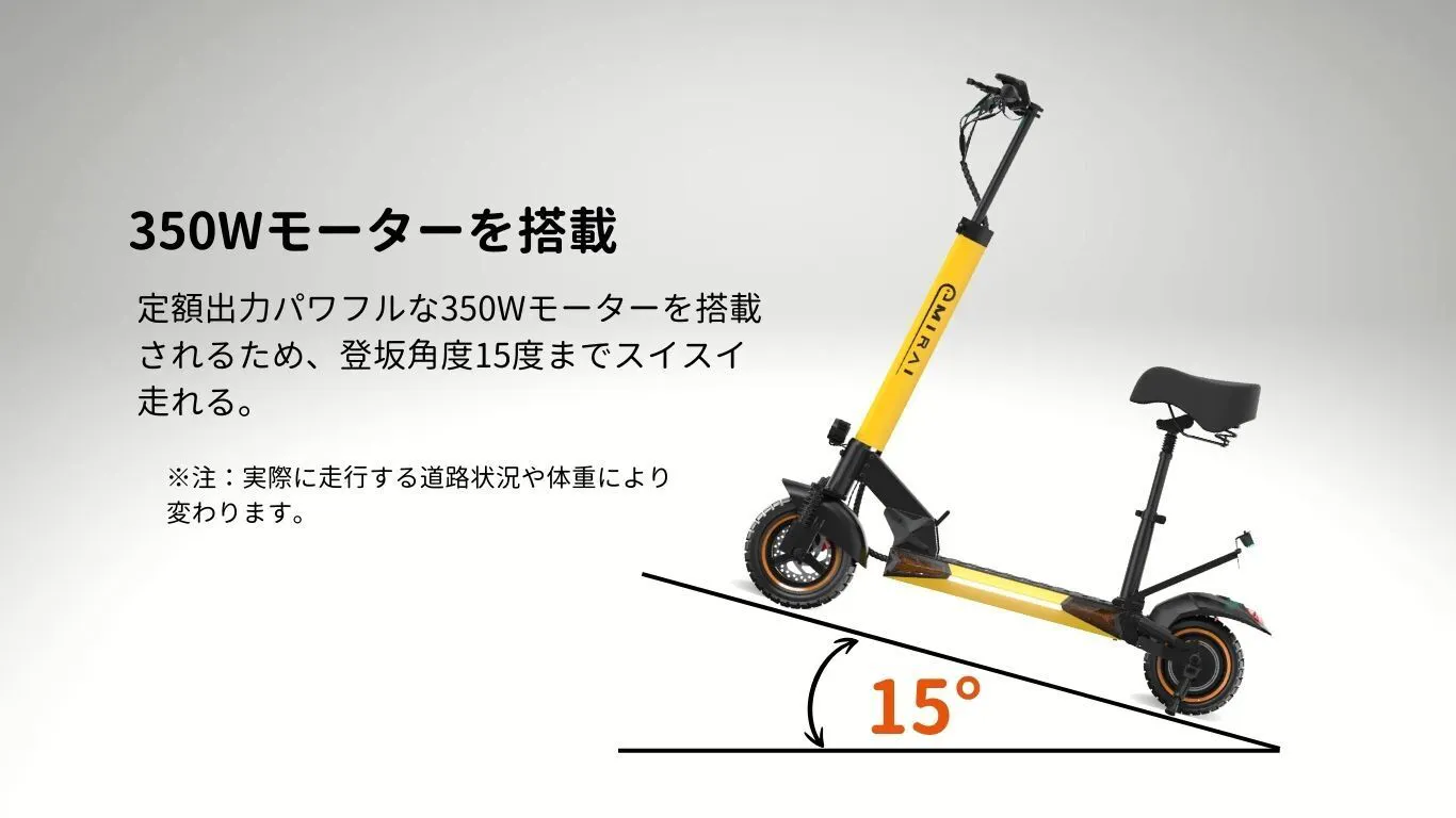 パワーフルな350Wモーターを搭載し、15度の登り坂でも難なく登れます。