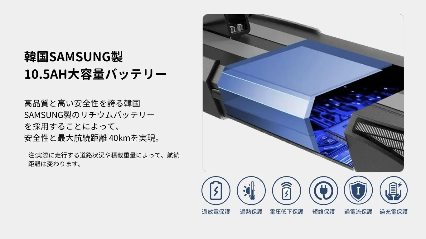 ■高い安全性韓国SAMSUNG製のバッテリーを採用 ユーザーの安全性を最優先に考え、高品質で高い安全性を誇る韓国SAMSUNG製の大容量10.5Ahバッテリーを採用しました。これにより、より安全にお使いいただけるとともに、最大航続距離40kmを実現しています。