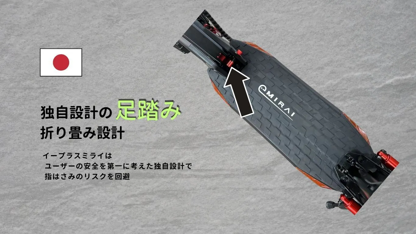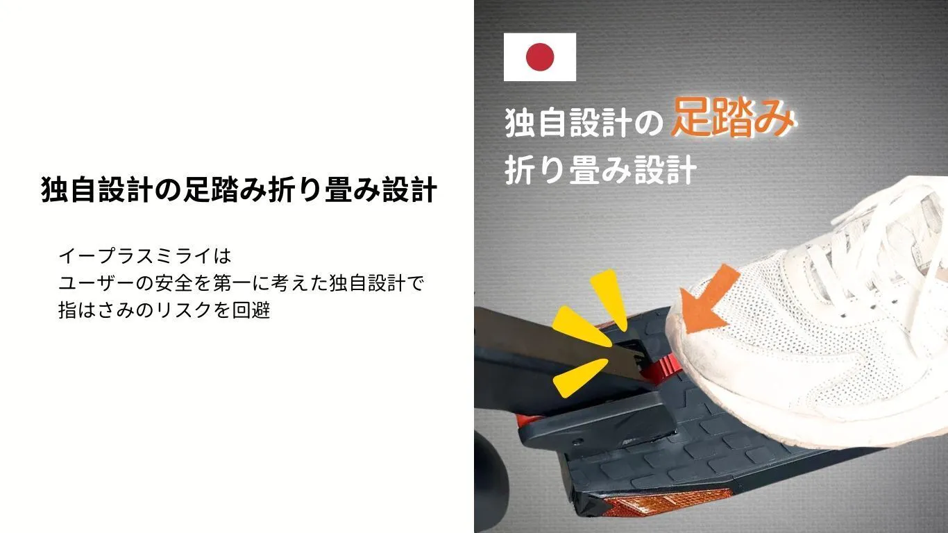 ■独自開発、足でたためる構造で指挟みのリスクを回避 イープラスミライの【Me】は、独自で考えた足でたためる構造を設計し、これにより、従来の手でたたむ方法に比べて、指を挟むリスクを避けて、安全に収納することができます。この革新的な設計は、ユーザーの安全を最優先に考えた結果です。