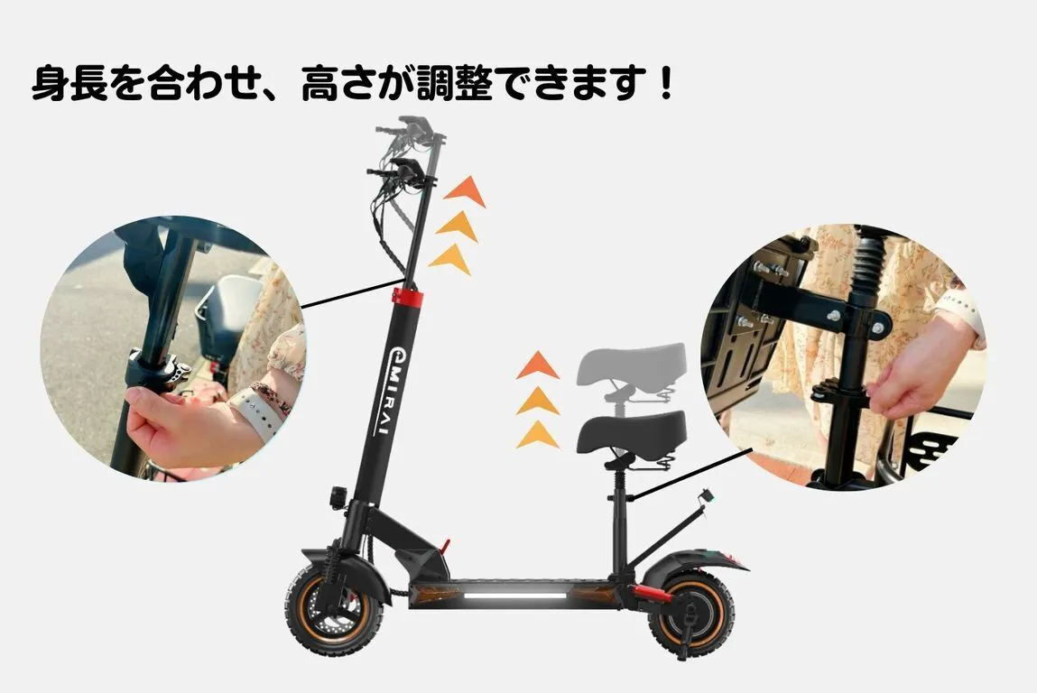 ●リラックスした移動:サドルを付けて自転車のようにリラックスした移動が可能。日常の移動がより楽しいものになります。快適な座り心地のサドルがクッションと前後ダブルサスペンションが付いてあるため、腰の負担が減り、長時間のライディングでも疲れにくく、通勤や中距離の移動に適しており、街中でのショッピングや観光、キャンプ場など多くのシーンで活躍します。
