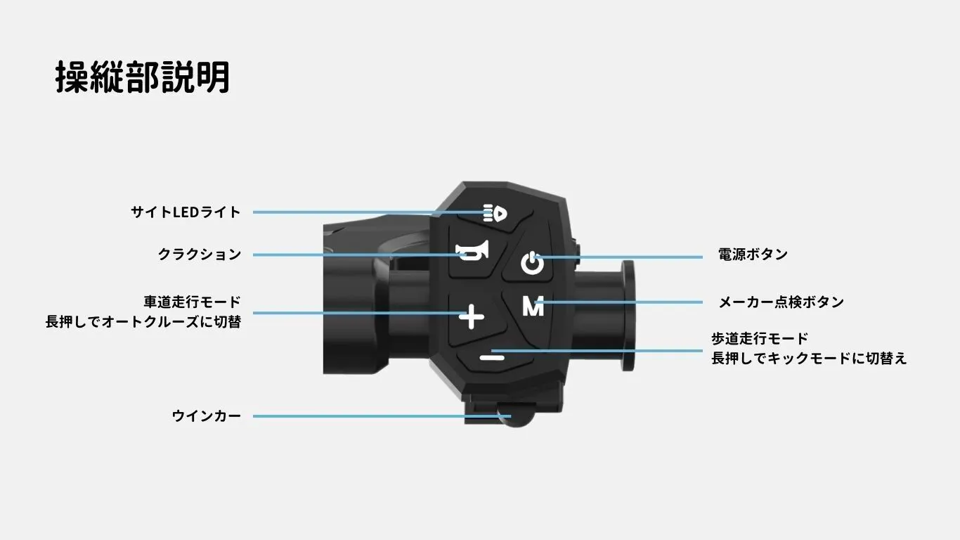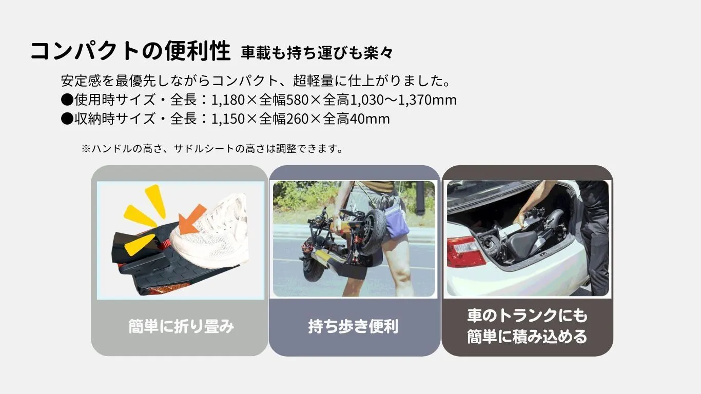 ●誰でも簡単に乗れる:直感的な操作スイッチとグリップ式アクセル、シートポストとハンドルポストの高さが調整可能で、自分に適した操縦位置を設定できます。老若男女を問わずにどなたでもすぐに乗りこなせる設計になており、家族みなでお使い頂けます。