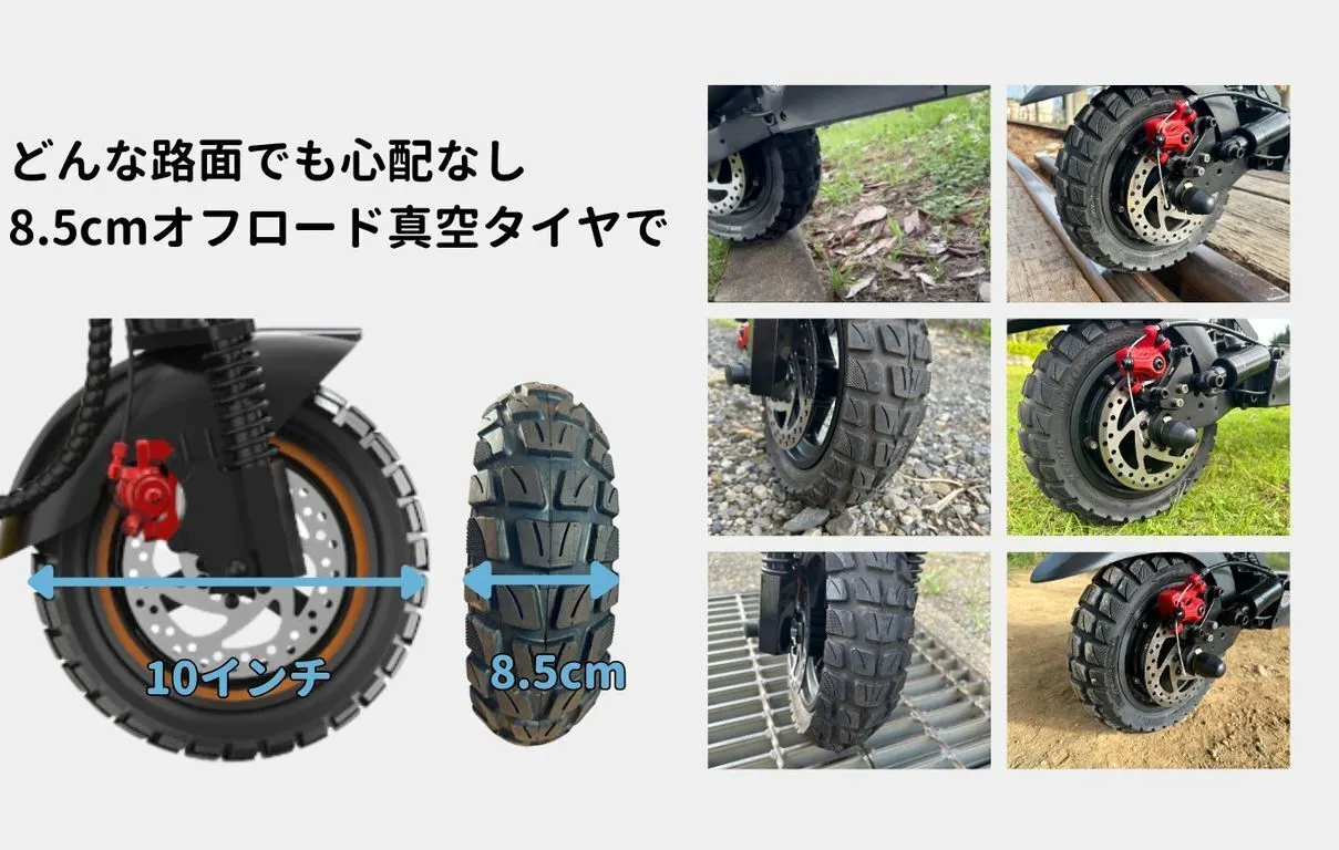 ■10インチチューブレスのオフロードタイヤを採用